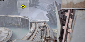Пройдя дальше, вы доберетесь до разрушенного ангара - таким образом вы разблокируете короткий путь, ведущий к посадочной площадке корабля. Бегите через деревню и турбинный центр, затем преодолевайте путь с движущимися платформами. Цель состоит в том, чтобы добраться до области с противниками и затем направляйтесь к пещере (2) справа.