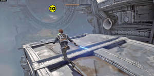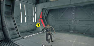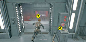 Уничтожьте решетку справа, затем используйте робота на переключателе (6), благодаря чему вы откроете дверь, ведущую в комнату, с штурмовиком (7). Победите его и бегите вдоль стены справа, затем используйте толчок на следующей решетке.