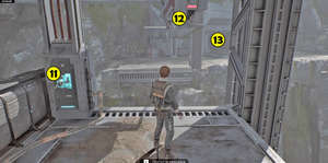 Используйте робота на панели (11), и после запуска механизма отключите питание, когда он находится перед героем, затем используйте веревку (12), чтобы добраться до другой стороны пропасти. Войдите на базу (13) и используйте лифт.