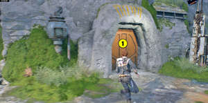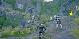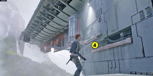 За пещерой вы встретите ворота, которые можно открыть с помощью дроида BD-1 на панели (3) слева. Войдя на базу, можете открыть дверь справа, за которой вы найдете точки медитации.