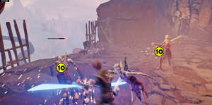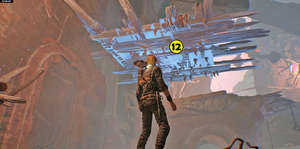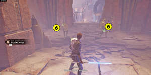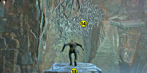 Идите вперед - через некоторое время вы доберетесь до противников, сидящих у костра. Победите их и продолжайте бежать, пока не дойдете до руин. Найдите деревянную платформу (12) под потолком. Притяните её, используя силу, и, когда она упадет на стену, бегите на другую сторону пропасти.