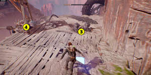 Продолжайте подниматься, пока не дойдете до деревянной платформы, где вы встретитесь с пауками (3), а затем используйте (4), благодаря чему вы разблокируете короткий путь. Двигайтесь вперед и поверните направо.