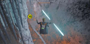 Вы достигнете валуна, на который нужно воздействовать силовым толчком. Запрыгните на него и поверните налево. Вы увидите стену (5) перед собой, дойдите до нее, после чего начинайте подниматься.