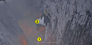 Поднимитесь по стене, а затем бегите по стене справа. Перепрыгните несколько раз, затем спрыгните на балку (1) и перепрыгните на каменную плиту (2). Двигайтесь дальше и завершите фрагмент скольжением и бегом по стене с последующим восхождением по стене.