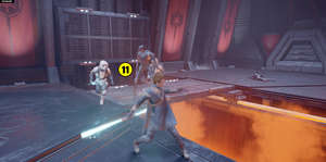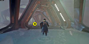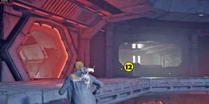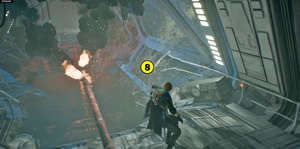 После того, как они будут побеждены в центре зала, решетки развернутся, и на арену вбегут другие солдаты (в общей сложности несколько групп). Можете облегчить бой, столкнув их (11) в пропасть. После боя взломайте компьютер с BD-1 и откройте дверь.