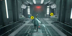 Сразитесь с противниками (2). Затем с помощью кнопки справа (3) откройте дверь. Вы встретите охранного дроида.