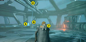 Прорывайтесь по коридору, заполненному врагами, и продолжайте идти в комнату с штурмовиками и дроидом. После устранения врагов, переместите генератор (4) в другую сторону комнаты и замедлите его. Затем вставьте кабель (5) в разъем (6), а затем используйте компьютер (7).