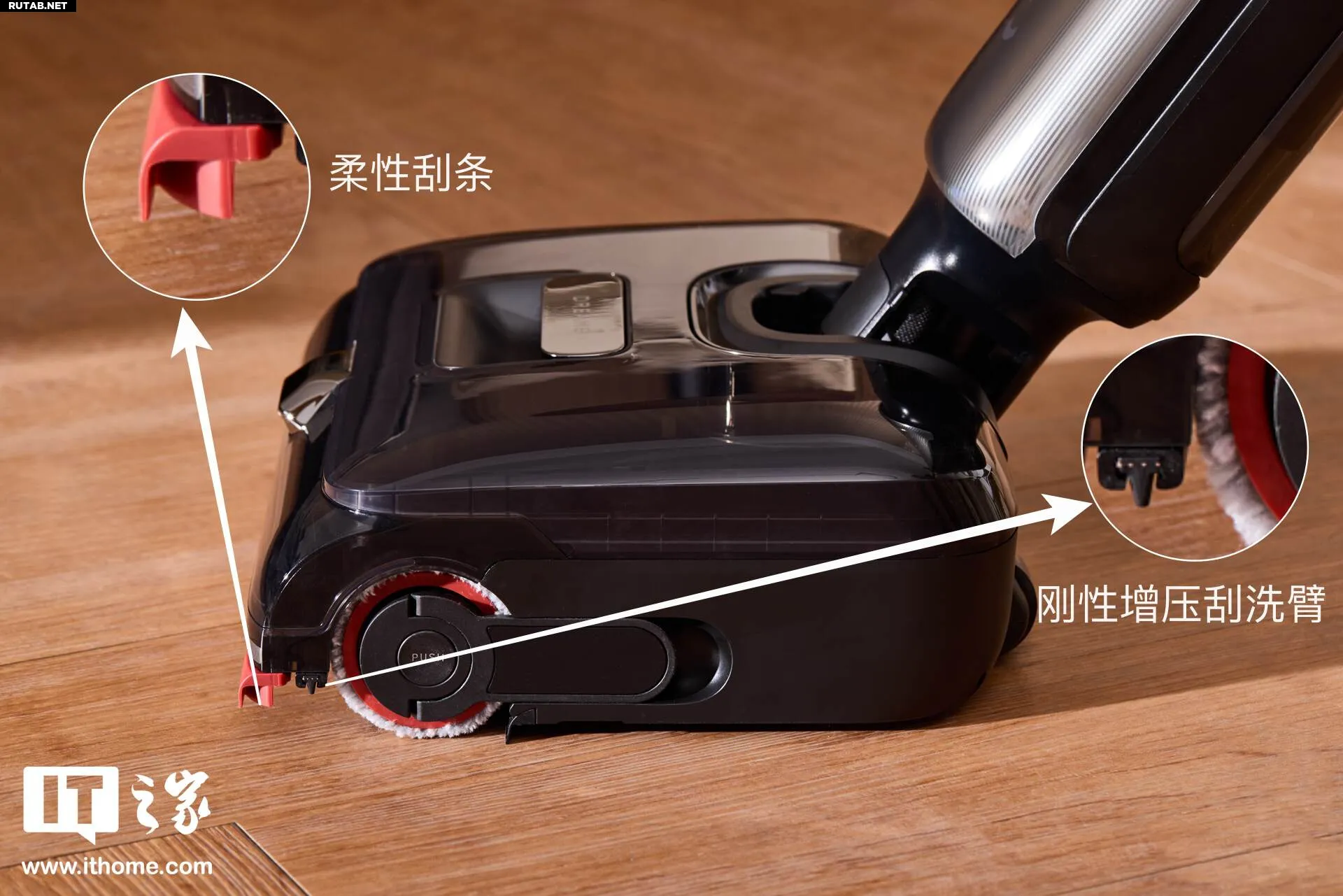 Гибкий скребок переднего манипулятора не только эффективно удаляет водяные пятна с пола, но и лучше прилегает к щелям вдоль стен, решая распространенную проблему недостаточной очистки краев у многих моющих пылесосов.