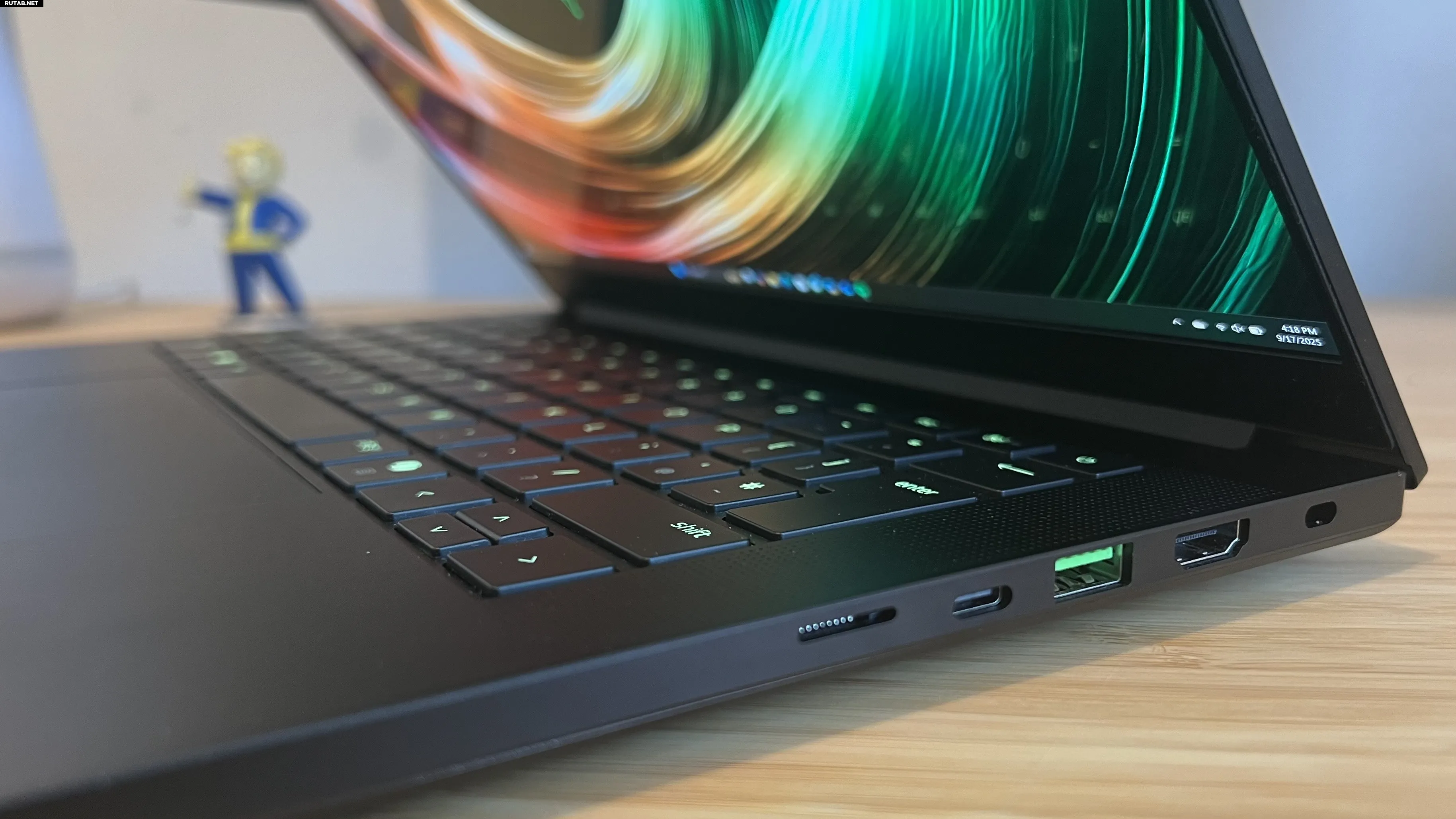 Razer уменьшил толщину своей 14-дюймовой модели до всего 0,64 дюйма (в закрытом состоянии). Большая часть этого пространства была сэкономлена в нижней части корпуса, что обеспечивает несколько более комфортный опыт при использовании за столом. У меня никогда не было проблем с переноской моей чуть более толстой модели в рюкзаке, поэтому я не полностью убеждён в преимуществах портативности такого сверхтонкого дизайна. Речь идёт о разнице в 0,06 дюйма. Предпочёл бы я это вместо опции с RTX 5080? Не уверен.