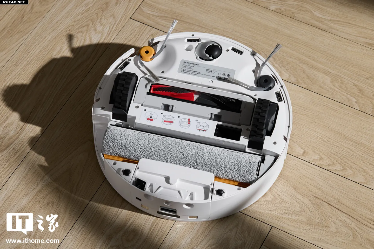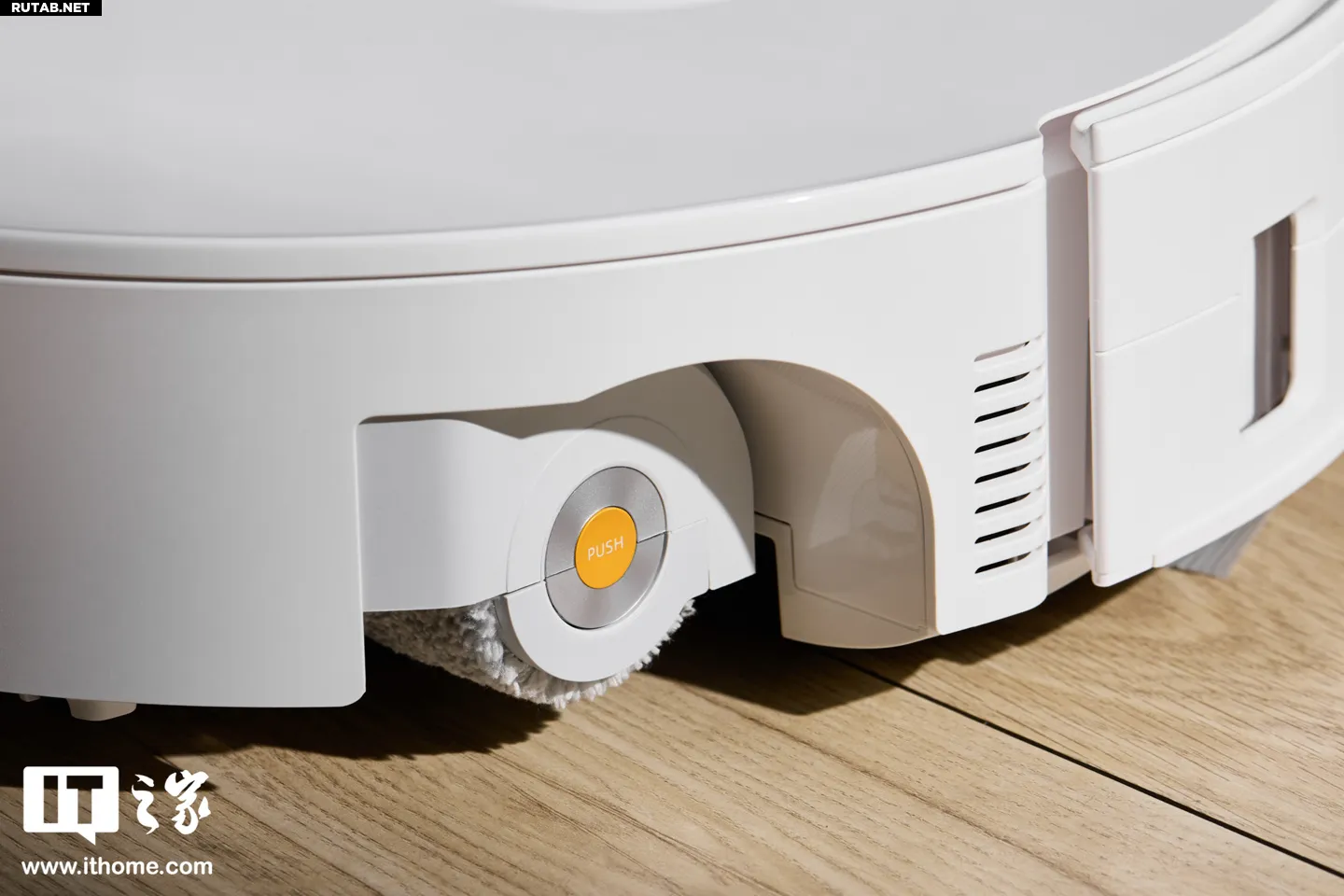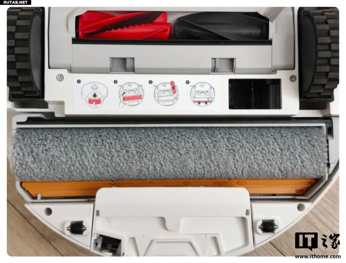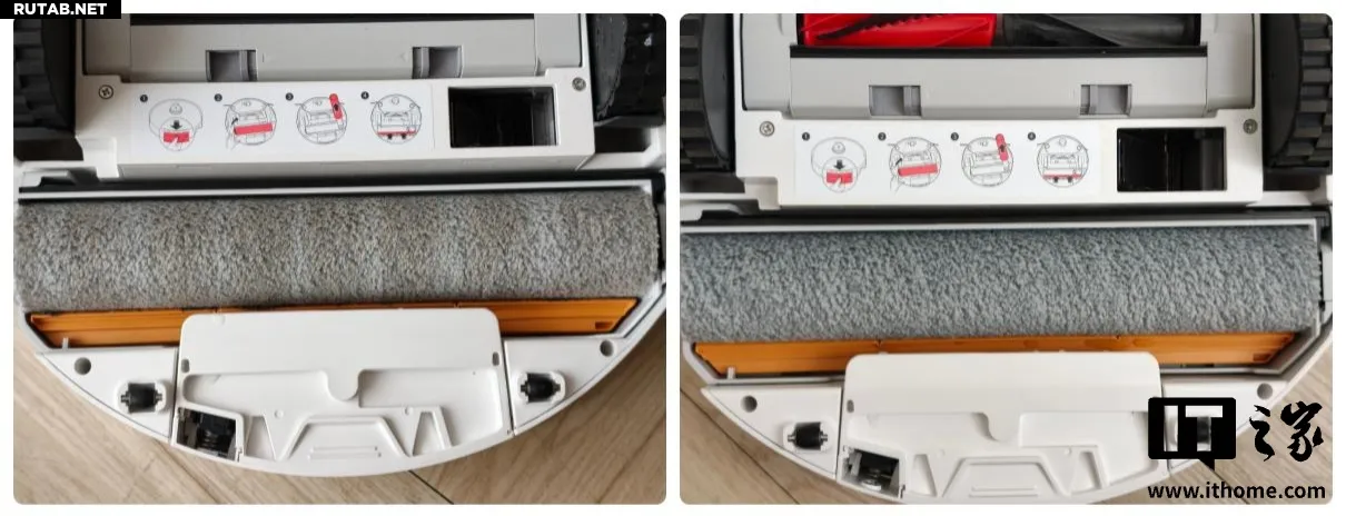 Самое заметное изменение в конструкции — снизу установлен вращающийся валик, как у паровой швабры, вместо привычной тряпки. Важно, что этот валик подвижный: он может подниматься/опускаться и выдвигаться вправо, увеличивая зону очистки и уменьшая пропуски под мебелью и в углах.