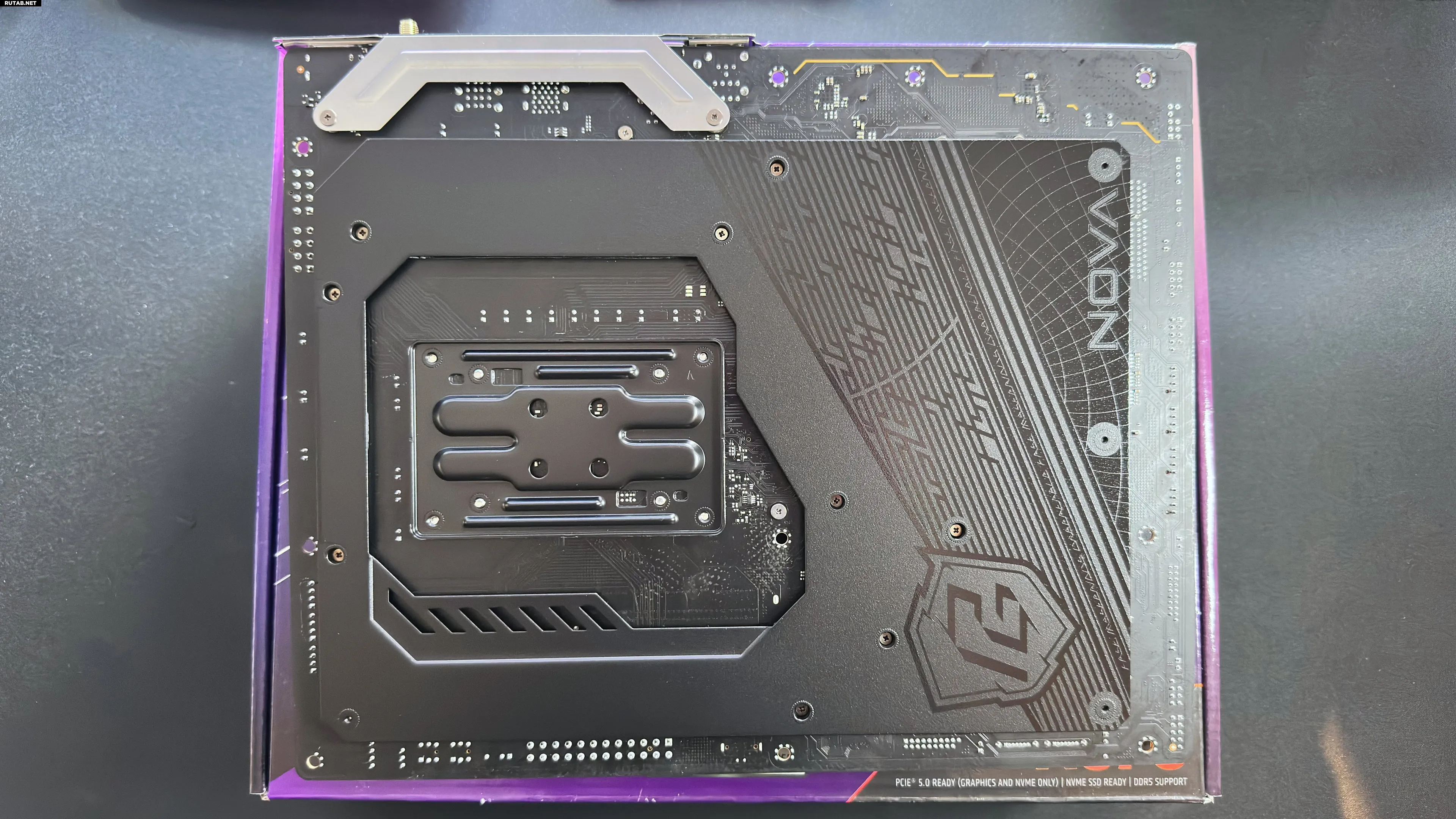 На обратной стороне материнской платы установлена массивная стальная пластина, предотвращающая прогиб под весом тяжёлой видеокарты. Хотелось бы, чтобы больше производителей использовали такое решение — X870 Nova ощущается очень прочной. Конечно, это увеличивает вес, но зато придаёт ощущение качества.