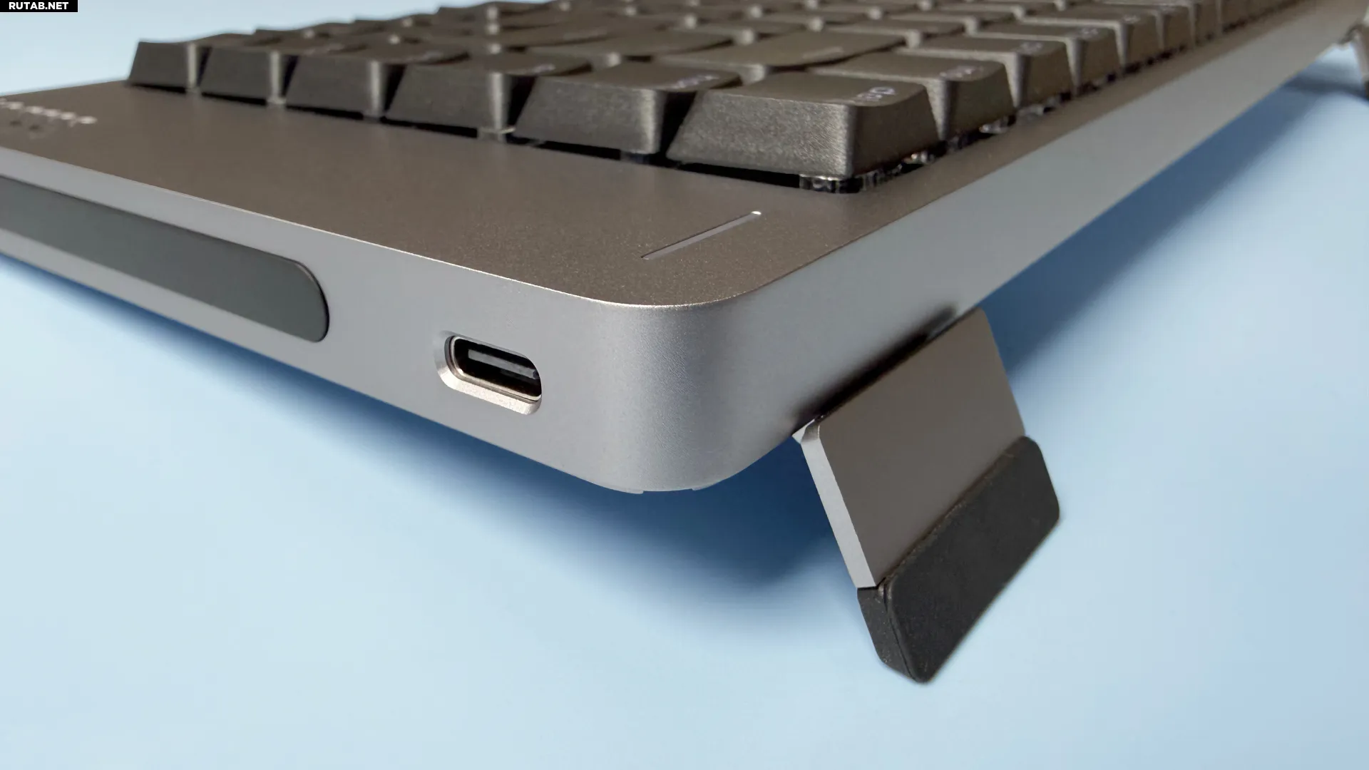 На нижней стороне корпуса появились два раскладных металлических упора, позволяющих регулировать угол наклона клавиатуры. Это важное улучшение — предыдущая модель Lofree Flow вообще не имела регулируемых ножек, и разница в комфорте печати ощутима. Дополнительный плюс: на обновлённой версии эти ножки скрывают переключатель режимов для перехода между проводным и Bluetooth-подключением или полного отключения клавиатуры.