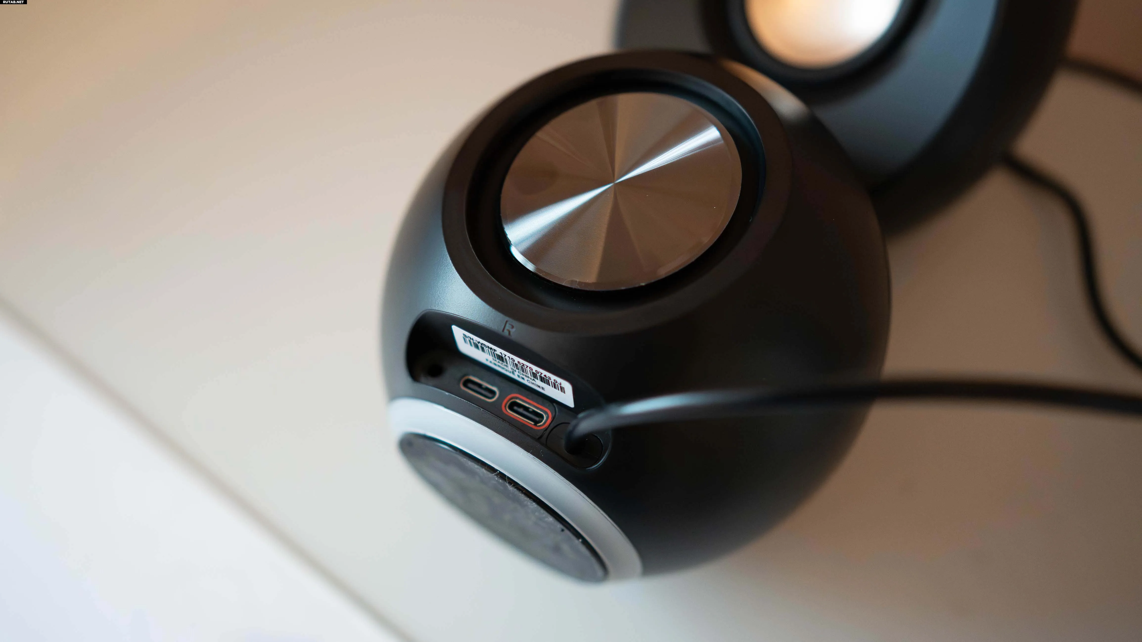 Доступно два варианта: USB-C или 3.5 мм AUX-вход (кабели входят в комплект) на задней панели правого динамика. На боковой стороне также расположены разъёмы для наушников и микрофона. Для оптимальной работы рекомендуется использовать USB-подключение — оно одновременно обеспечивает питание колонок. Однако в этом случае максимальная мощность звука ограничивается 20 Вт.