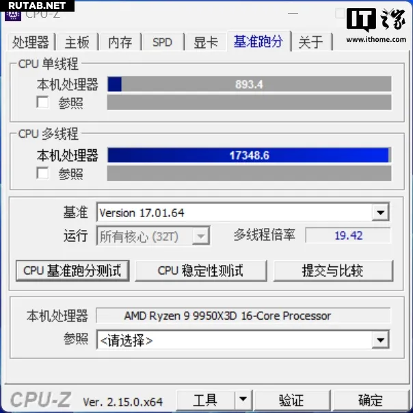 процессор Ryzen 9 9950X3D в режиме по умолчанию набрал 893 балла в однопоточном и 17 348 баллов в многопоточном режиме;