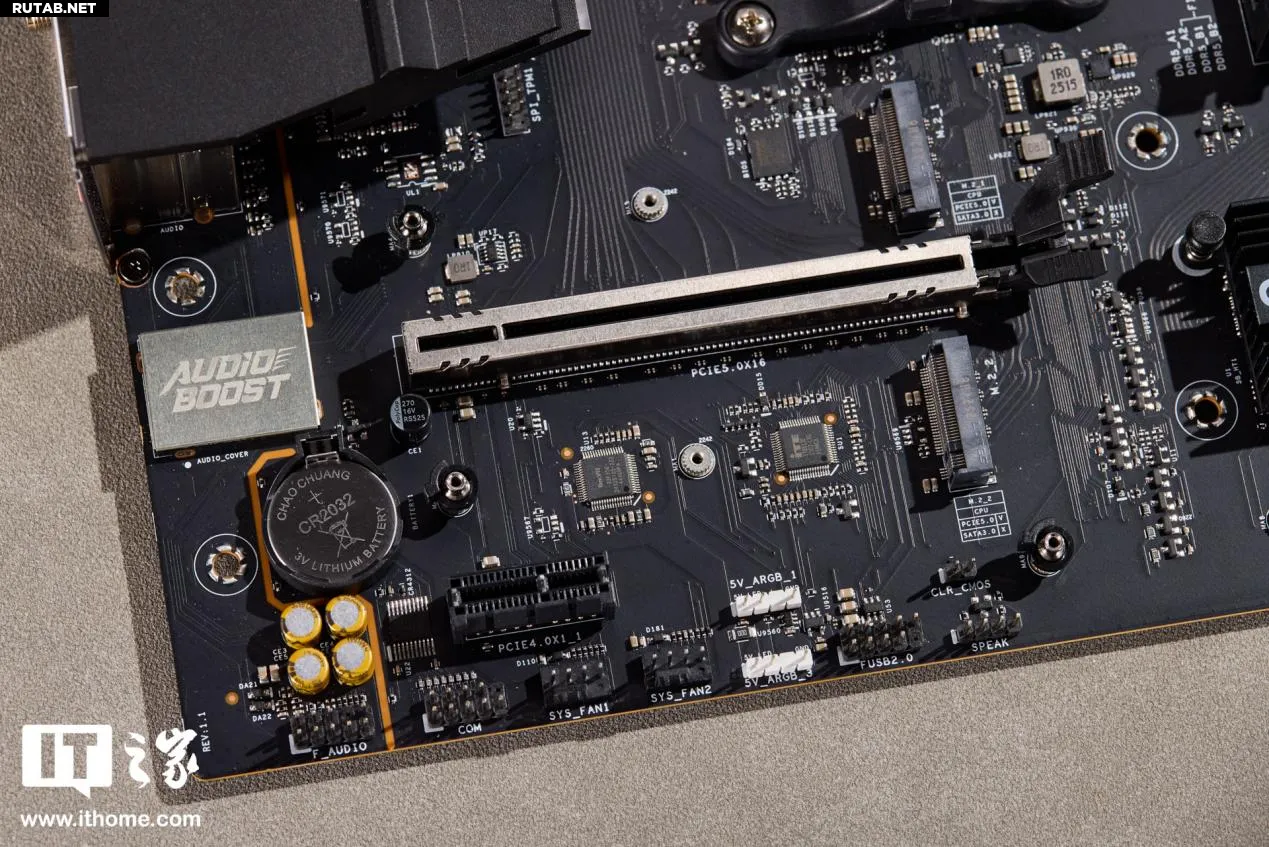 Ниже процессора находится один усиленный стальной рамкой слот PCIe 5.0 x16 для видеокарты. Над ним и под ним расположены по одному разъёму M.2 с поддержкой PCIe 5.0. Ещё ниже — слот PCIe 4.0 x1 для дополнительных устройств (например, звуковой карты). В правом нижнем углу платы находится третий слот M.2 (PCIe 4.0) и четыре порта SATA, что обеспечивает отличную расширяемость хранилищ.