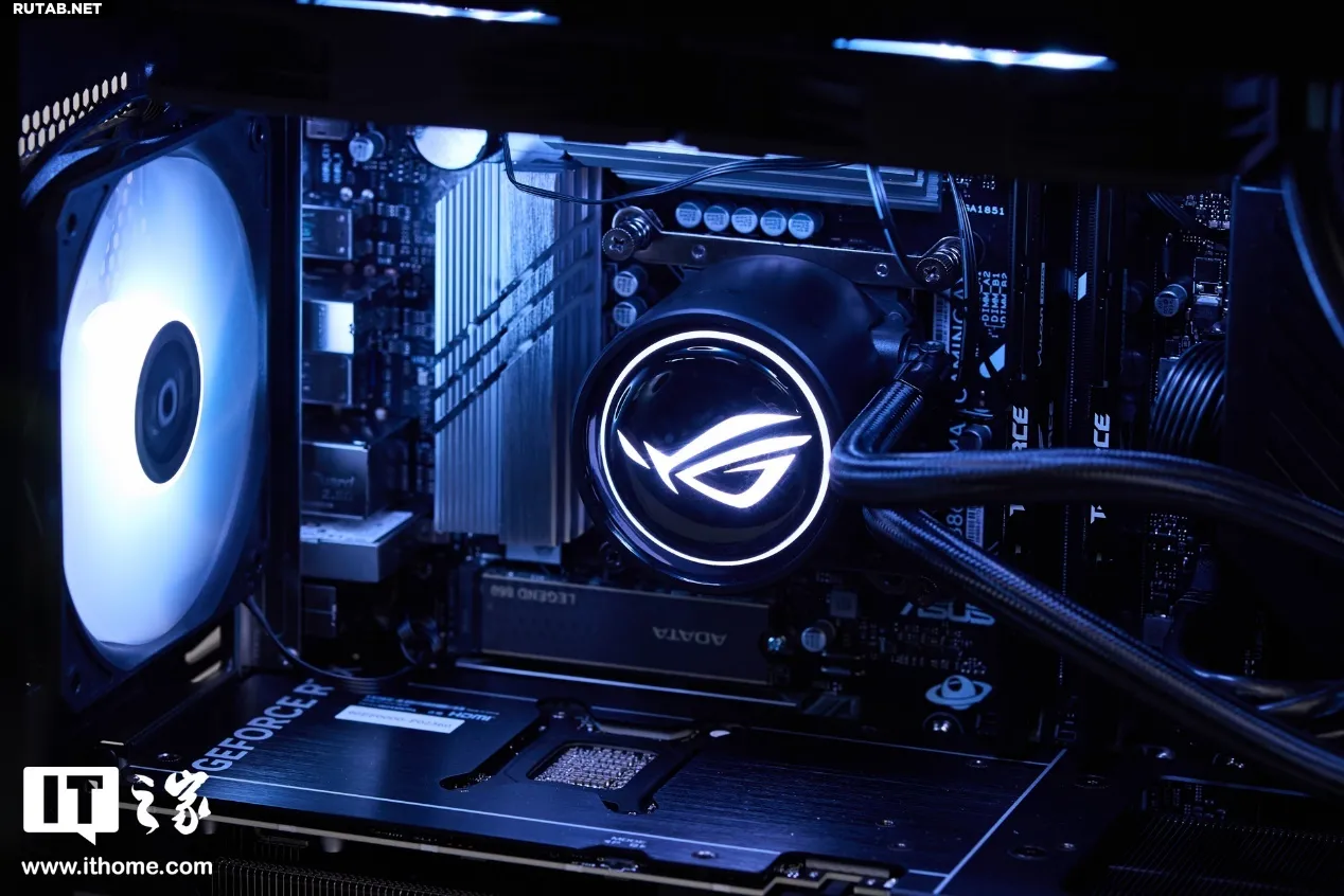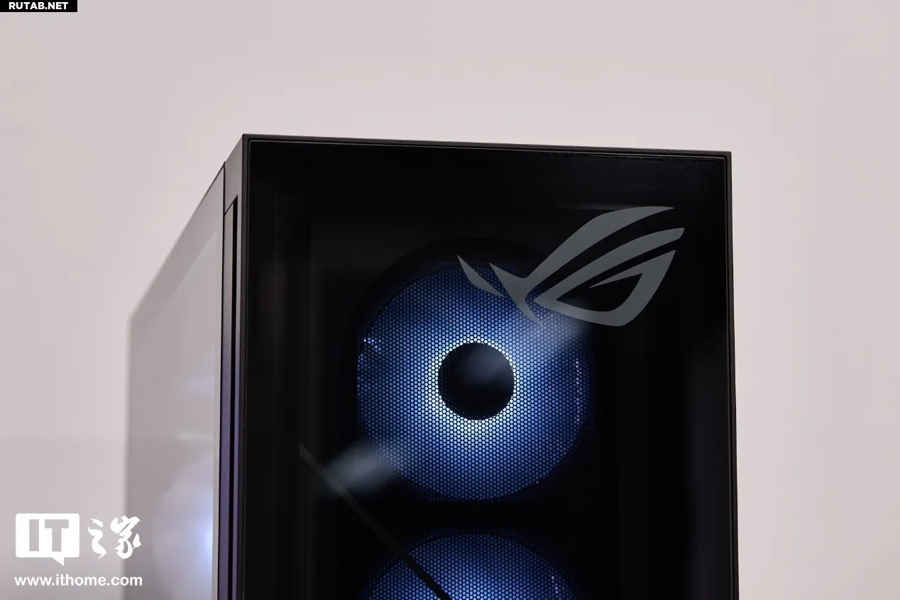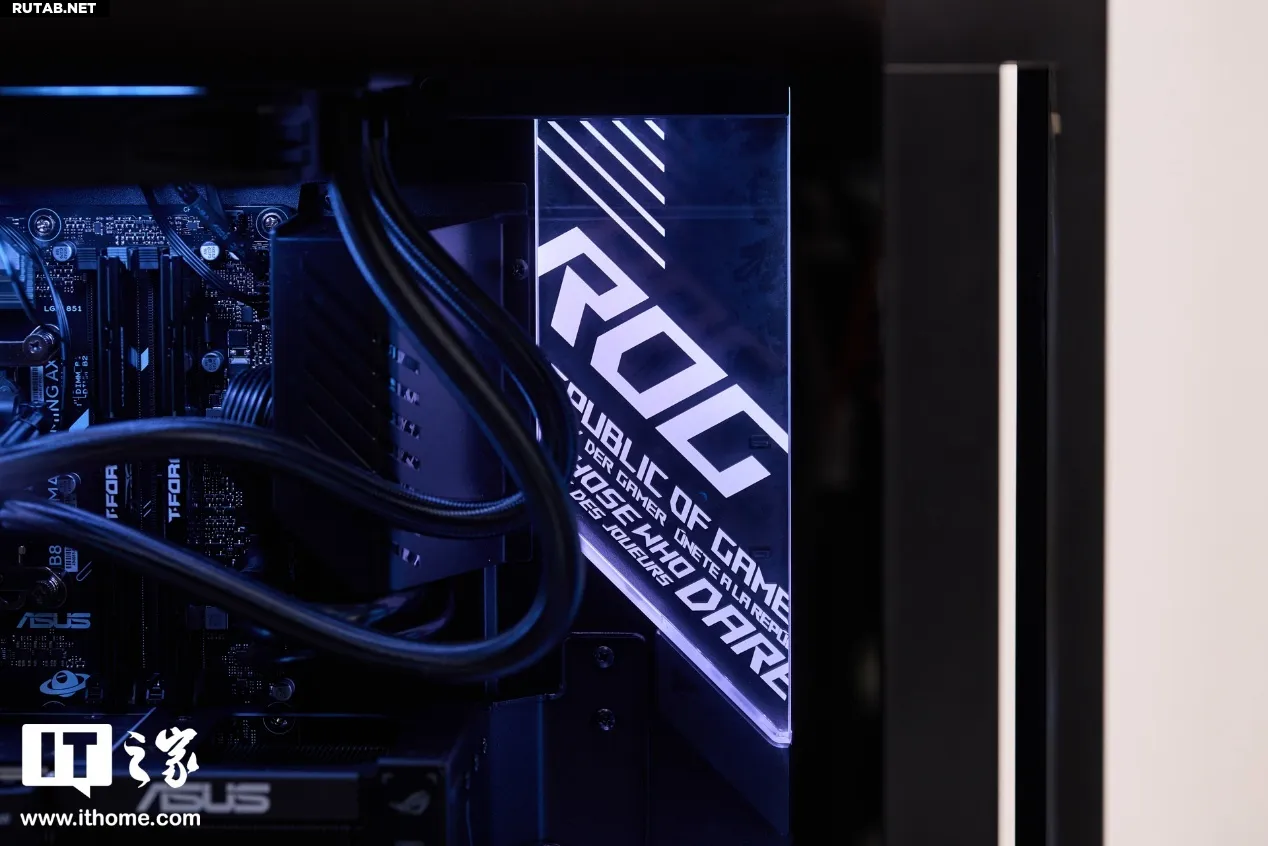 Внутри корпуса выделяется подсвеченный кулер с логотипом ROG на помпе. Вентиляторы на 240-мм радиаторе и задний вентилятор также имеют RGB-подсветку, ярко освещая материнскую плату и тыльную сторону видеокарты. Задняя панель ввода-вывода и зона крепления материнской платы усилены алюминиевой пластиной для повышения жёсткости и долговечности разъёмов.
