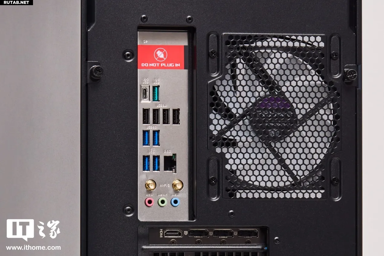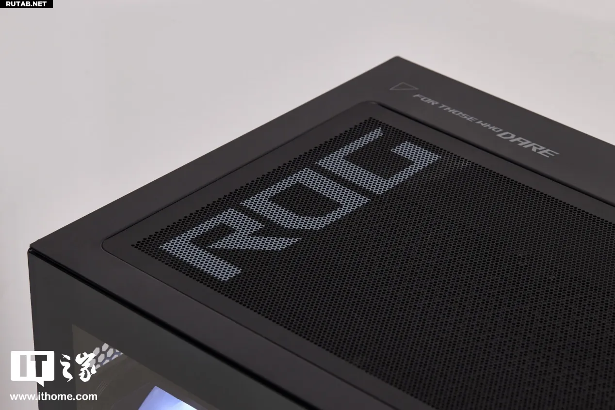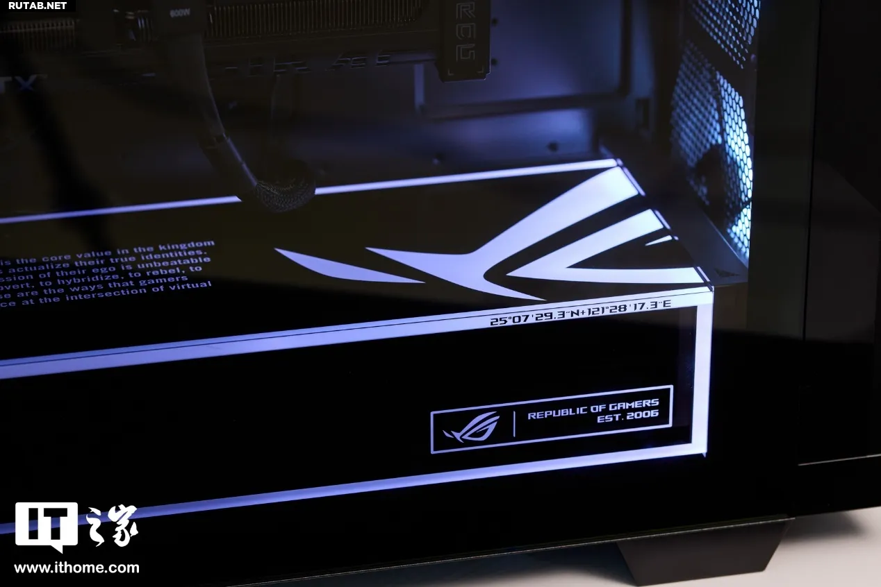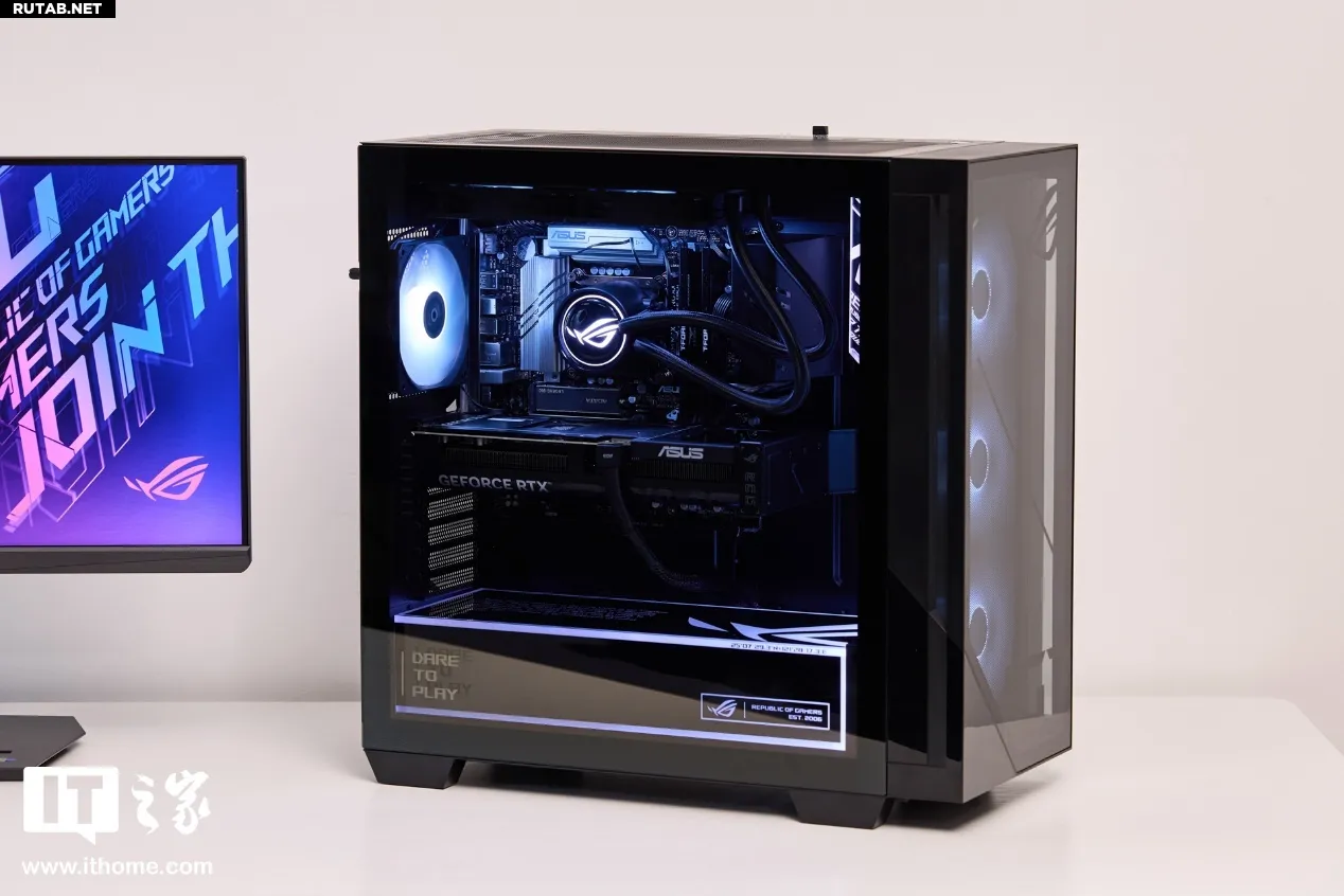 Внутри корпуса выделяется подсвеченный кулер с логотипом ROG на помпе. Вентиляторы на 240-мм радиаторе и задний вентилятор также имеют RGB-подсветку, ярко освещая материнскую плату и тыльную сторону видеокарты. Задняя панель ввода-вывода и зона крепления материнской платы усилены алюминиевой пластиной для повышения жёсткости и долговечности разъёмов.