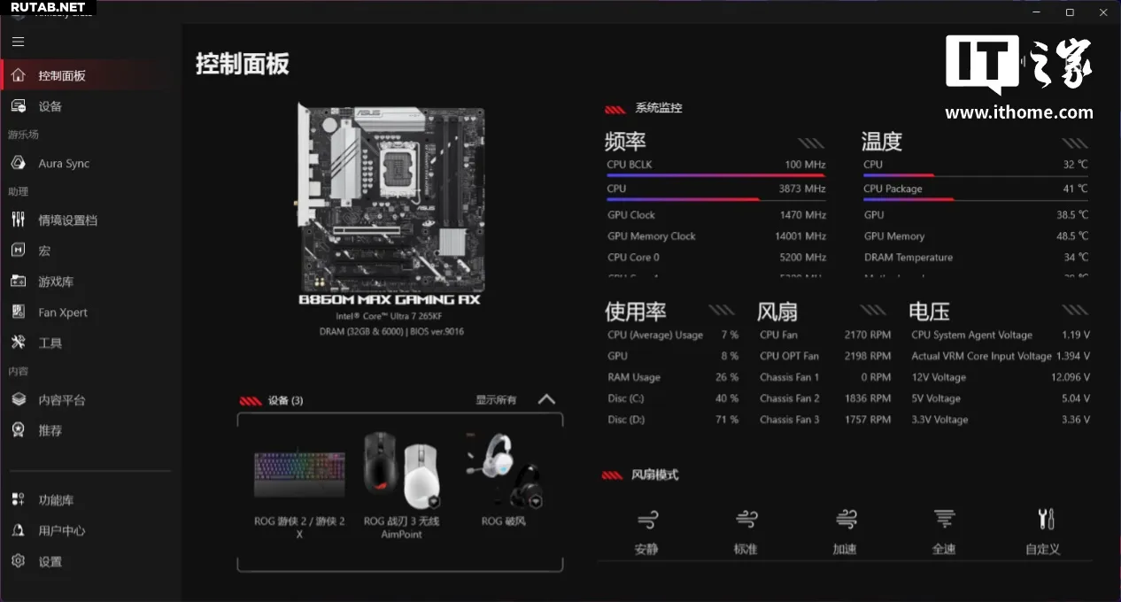 Даже если требуется точная регулировка вентиляторов, сделать это в Armoury Crate с помощью мыши гораздо удобнее и быстрее, чем в BIOS. Все подключённые устройства — материнская плата и периферия — отображаются в виде интерактивных изображений: клик по картинке сразу открывает меню настроек соответствующего устройства.