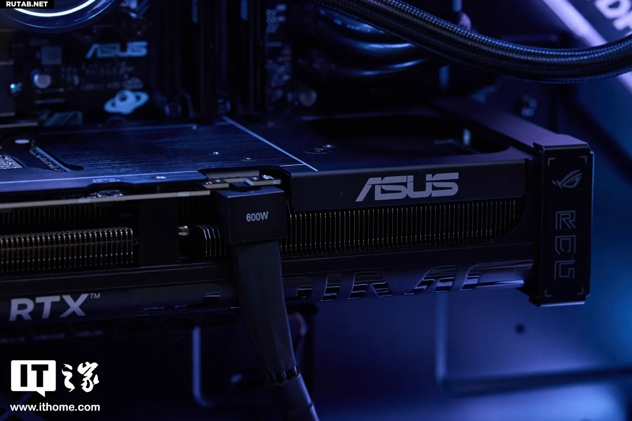 Справа от видеокарты установлена опора, которая надёжно фиксирует её. На опоре нанесён культовый логотип ROG в виде глаза и текстовый логотип. Конструкция доходит до уровня верхнего края материнской платы, обеспечивая дополнительную жёсткость крепления видеокарты, служит для аккуратной укладки кабелей и повышает безопасность при транспортировке, предотвращая повреждения материнской платы и видеокарты, характерные для пересылки DIY-сборок.