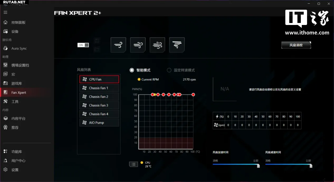 Главное отличие программы Armoury Crate — простой и интуитивно понятный интерфейс. Например, в правом нижнем углу главного экрана можно выбрать один из четырёх предустановленных режимов работы вентиляторов: Тихий, Стандартный, Ускоренный или Максимальный. Переключение происходит мгновенно, без необходимости перезагрузки системы и ручной настройки кривых вращения в BIOS.