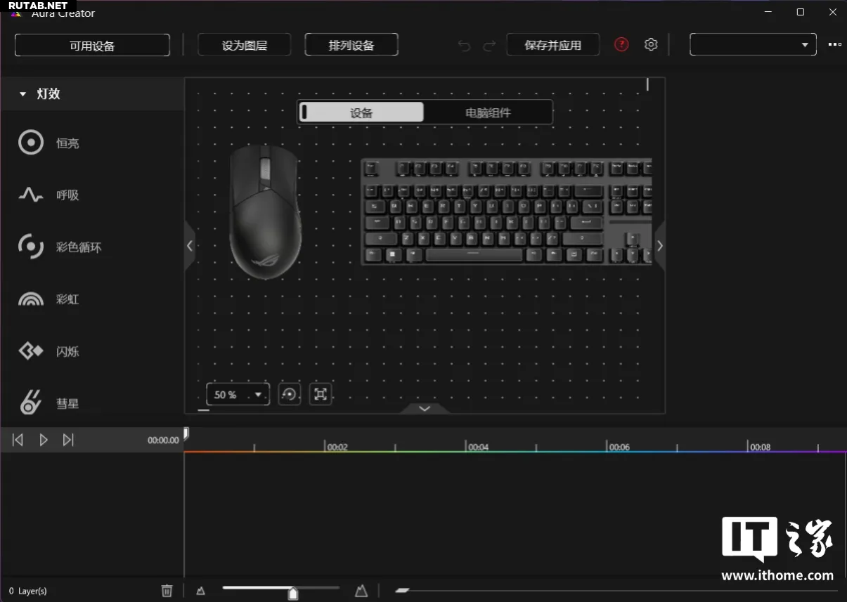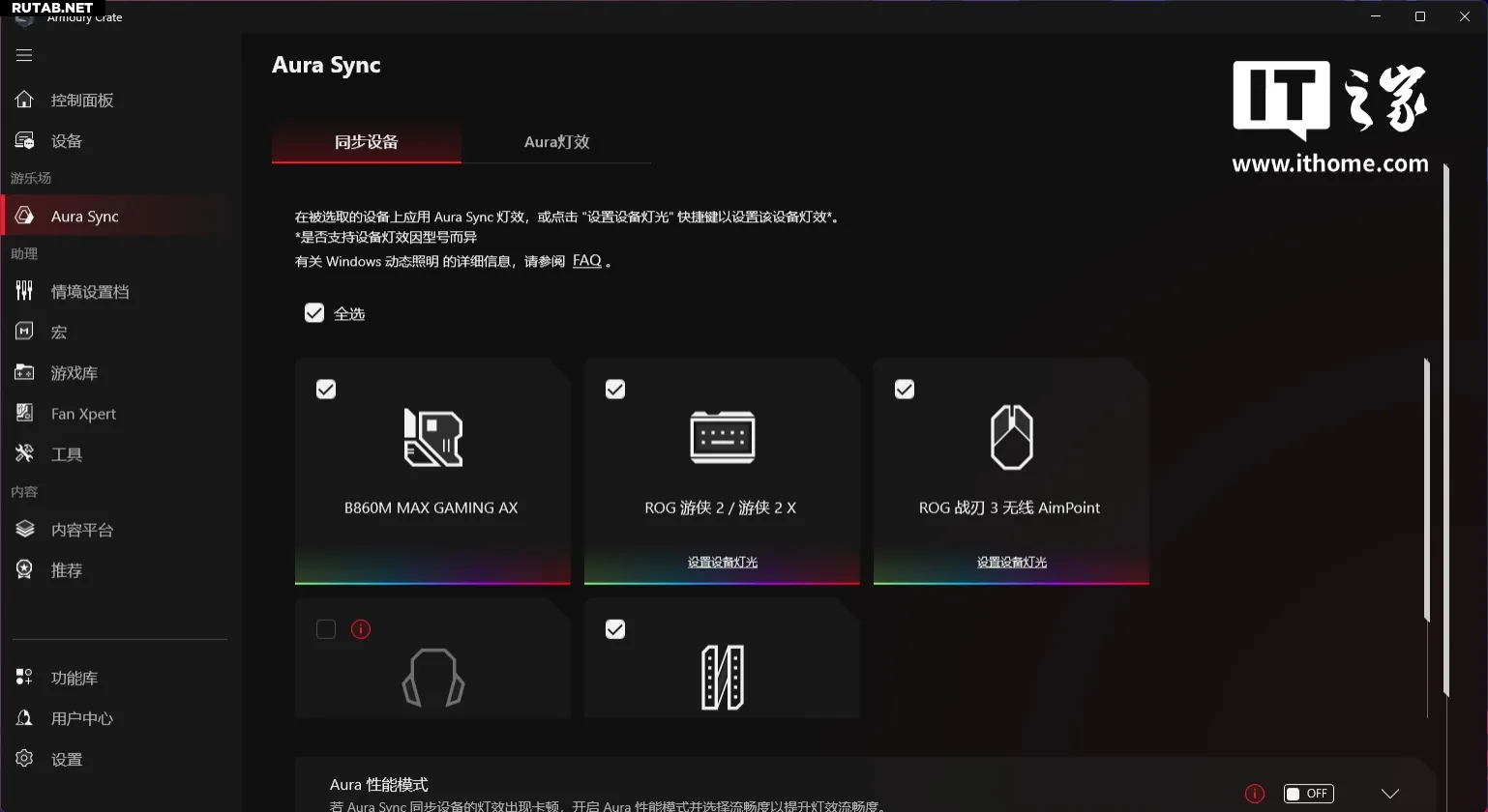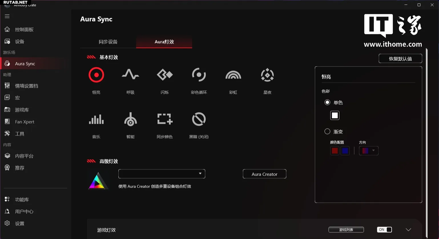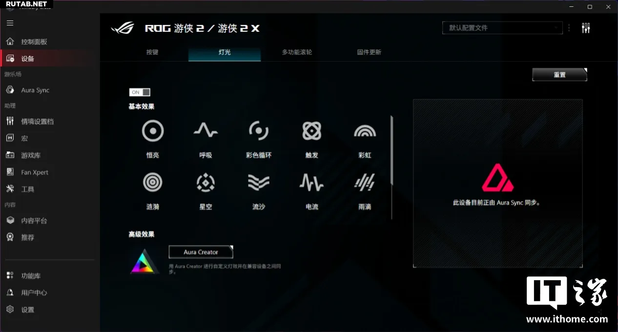 Упомянутую ранее синхронизацию подсветки Aura Sync можно быстро настроить, открыв соответствующую вкладку в Armoury Crate. Все совместимые устройства отображаются в виде значков. Их можно синхронизировать глобально или выбрать исключения. Доступно множество готовых эффектов, а для творческих пользователей есть редактор Aura Creator, позволяющий создавать уникальные комбинации подсветки.