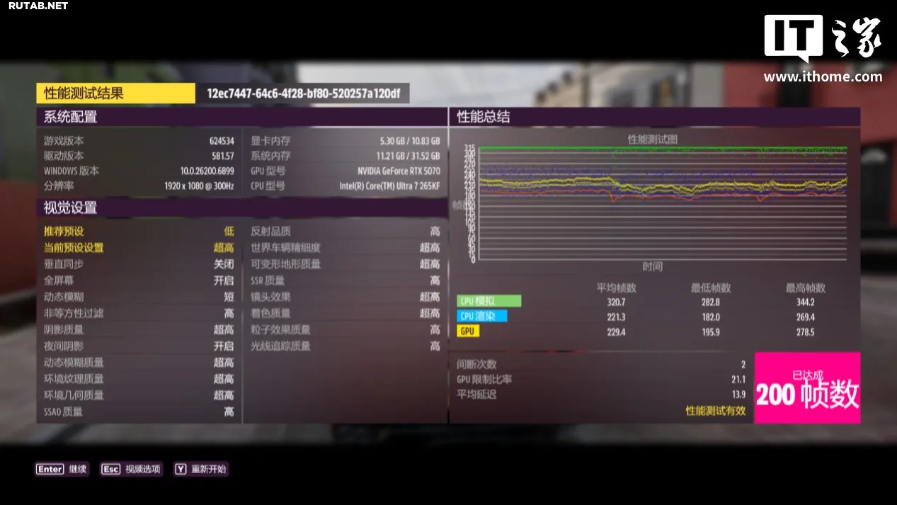 Далее мы протестировали две крупные однопользовательские игры, ориентированные на растеризацию. В гоночной игре Forza Horizon 5 с настройками 1080p и экстремальным качеством графики встроенный бенчмарк показал средний результат в 200 кадров/с, а 1% Low составил 154 кадра/с.