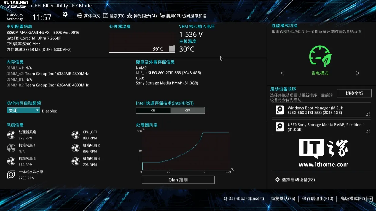 Что касается интерфейса BIOS, то материнская плата B860M MAX GAMING AX в ROG Strix GT15 практически не отличается от розничной версии. Однако, поскольку для готовых систем стабильность работы оборудования и системы является приоритетом, здесь не предусмотрены предустановки режимов разгона, а только два режима: «Энергосбережение» и «Сбалансированный».