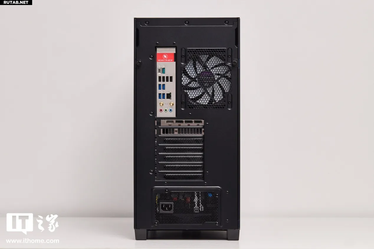 Дизайн задней панели корпуса выполнен в классическом стиле. Видеовыходы материнской платы закрыты заглушкой, чтобы неопытные пользователи по ошибке не подключили к ним монитор. Конфигурация панели ввода-вывода ориентирована на практичность и включает: