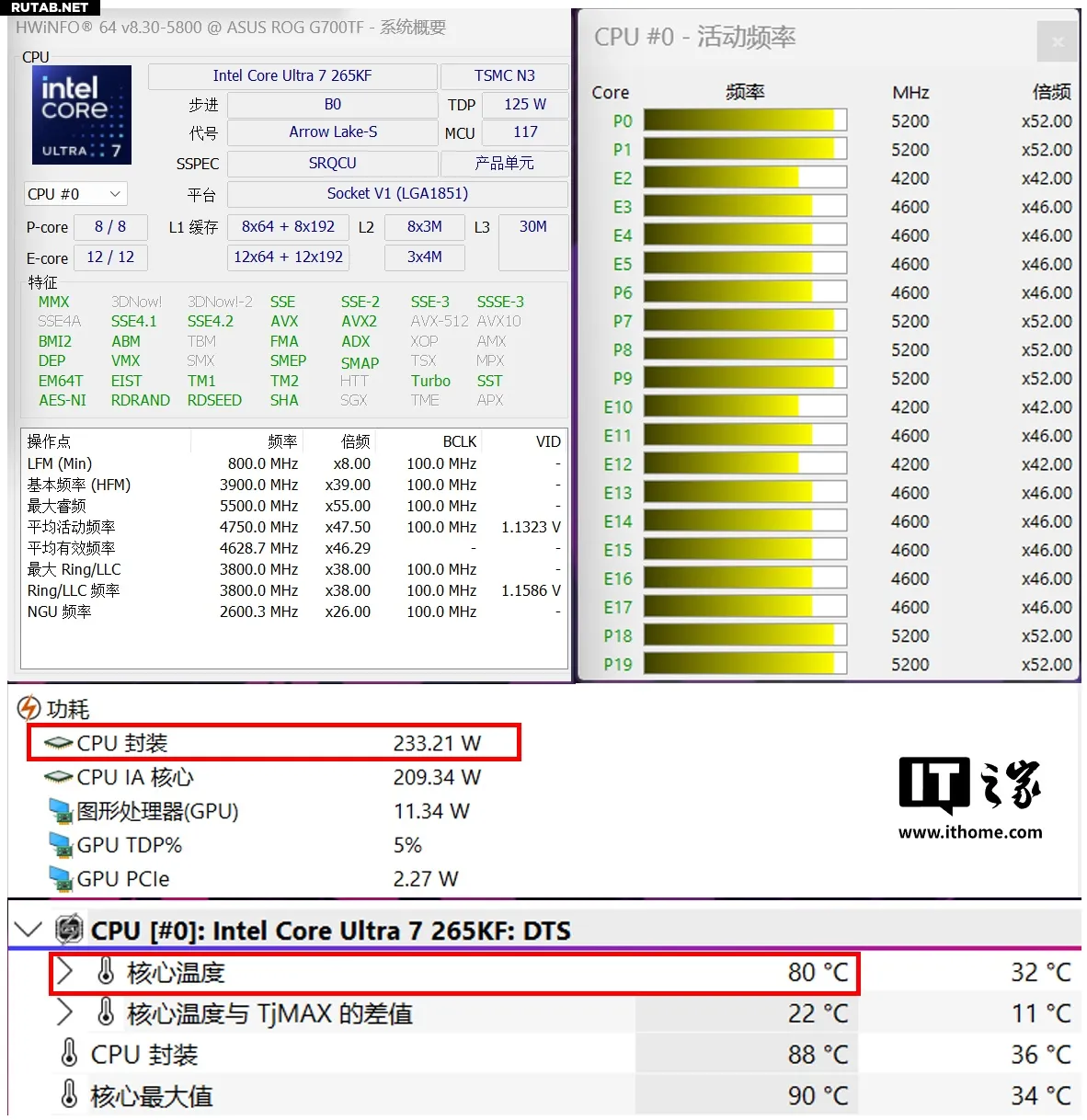 Одним из ключевых преимуществ процессора является сниженное энергопотребление. Если его предшественник, Core i7-14700KF, при стресс-тесте потреблял до 300 Вт, то Core Ultra 7 265KF в ROG Strix GT15 показал результат всего 233 Вт в 10-минутном тесте AIDA64 FPU.