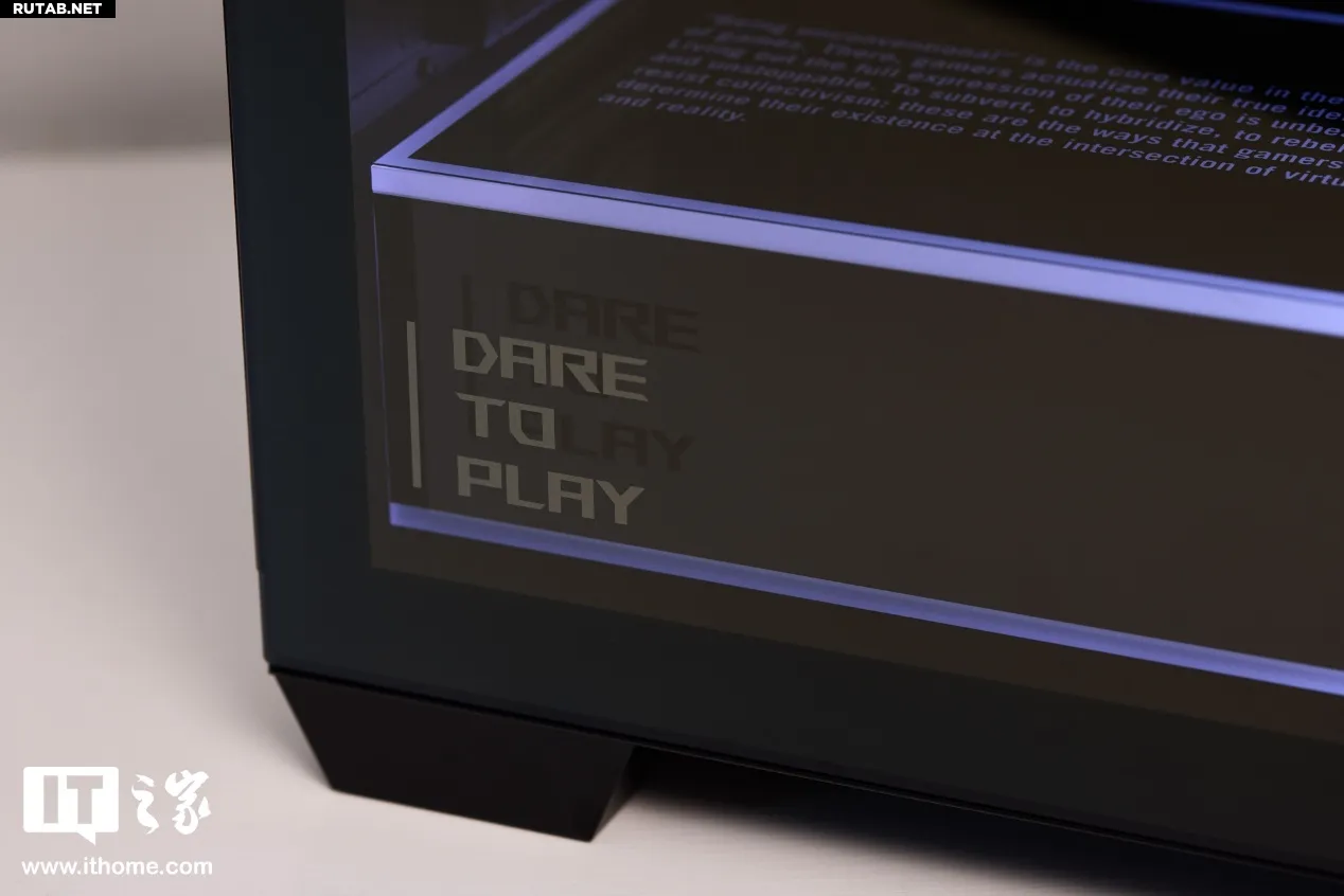 Ниже расположена большая прямоугольная панель-основание с подсветкой, внутри которой скрыты блок питания и отсек для SATA-накопителей. На панели множество светящихся декоративных элементов: текстовая гравировка слева вверху, половина логотипа ROG в виде глаза справа вверху, фирменная табличка ROG на боковой грани и световая полоса по всему периметру. Всё это устраняет ощущение пустоты в нижней части корпуса, создавая многоуровневое и насыщенное световое оформление.