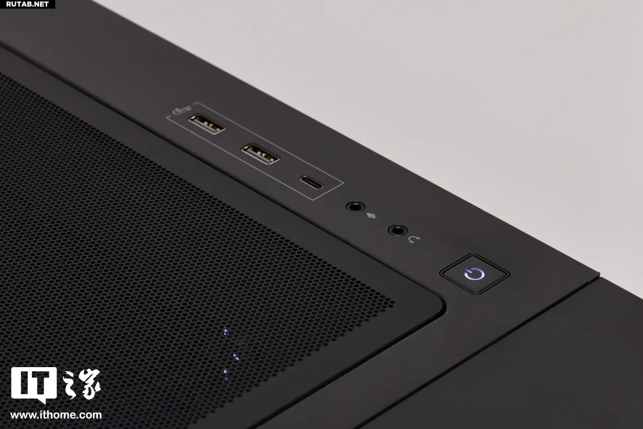 Сверху спереди расположены 2 порта USB 3.2 Type-A, 1 порт USB 3.2 Type-C, комбинированный аудиоразъём 3.5 мм и кнопка питания с белой индикацией.