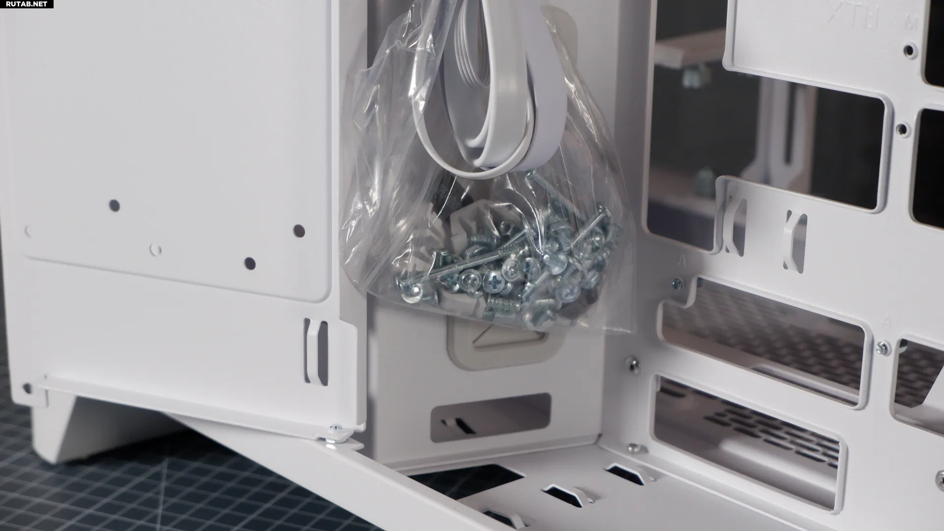 Первое впечатление от корпуса оказалось неоднозначным. Внутри нас встретил мешок с болтами и крепёжными элементами — это самый неорганизованный набор аксессуаров, который я видел в компьютерных корпусах. Беспорядочная смесь винтов, стяжек и липучки выглядит как худший сувенир на вечеринке.