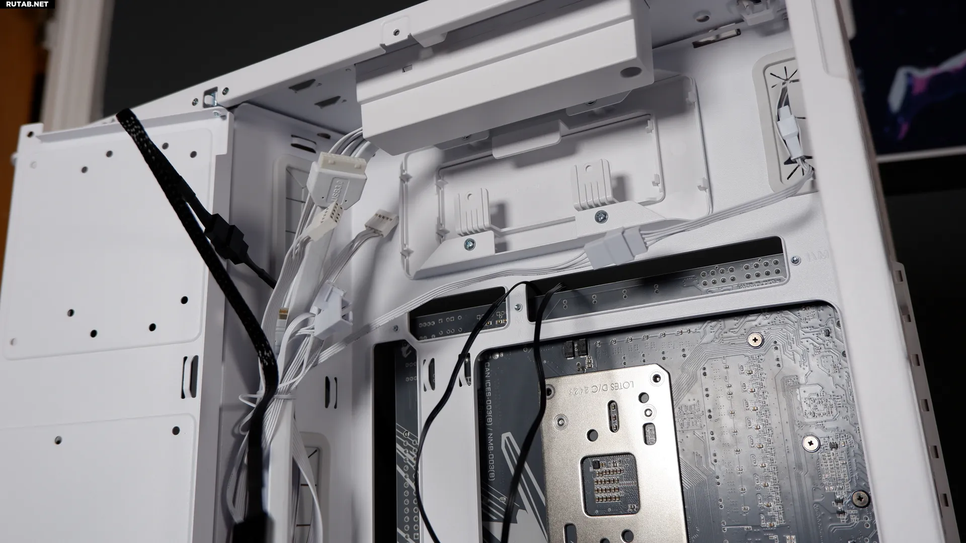 Тыльная сторона корпуса предлагает довольно продуманную конструкцию для прокладки кабелей. Здесь не так много возможностей — заметная нехватка стяжек или каналов, — но подождите, есть дверца, которая скрывает всё. Так что вам не нужно быть слишком аккуратным, чтобы всё уложить и придать эстетичный вид. Дверца скроет все провода.