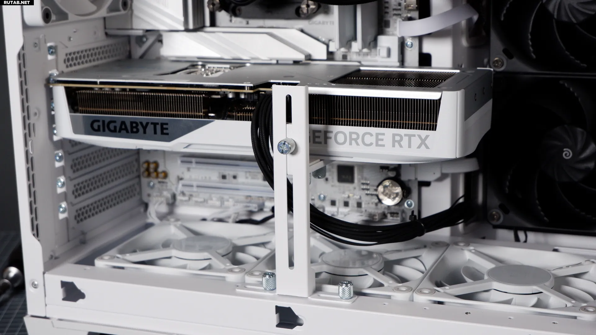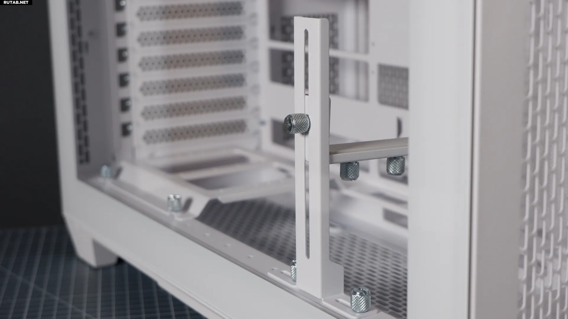В View 390 Air достаточно места для видеокарты: 390 мм или 420 мм, если спереди ничего нет. Даже самые крупные современные видеокарты не превысят этот лимит. Также в комплекте идёт поддержка видеокарты с хорошим диапазоном регулировки под карты разных размеров. Жаль только, что серебристые винты с накаткой — которых здесь много — так заметны.