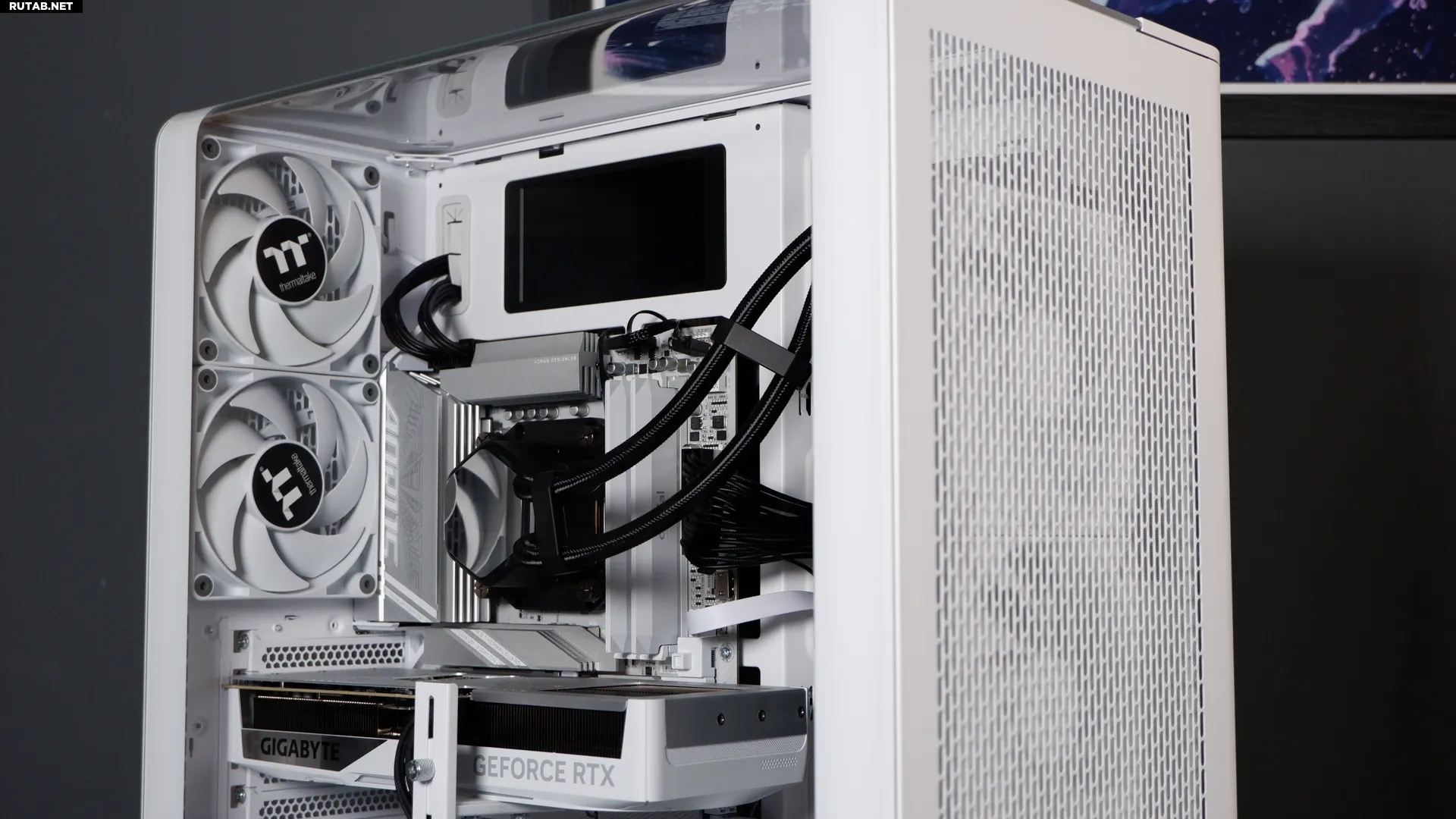В этой сборке я использовал 6-дюймовый экран от Thermaltake, но не могу его рекомендовать. В верхней части корпуса есть удобный вырез для установки экрана, который легко монтируется и требует всего одного кабеля для подключения USB 2.0. Управление экраном осуществляется через приложение TT RGB Plus от Thermaltake, но оно работает с задержками и запутанно в использовании. Сам экран чрезмерно дорогой для своих возможностей — официальная цена составляет около $100/£100.