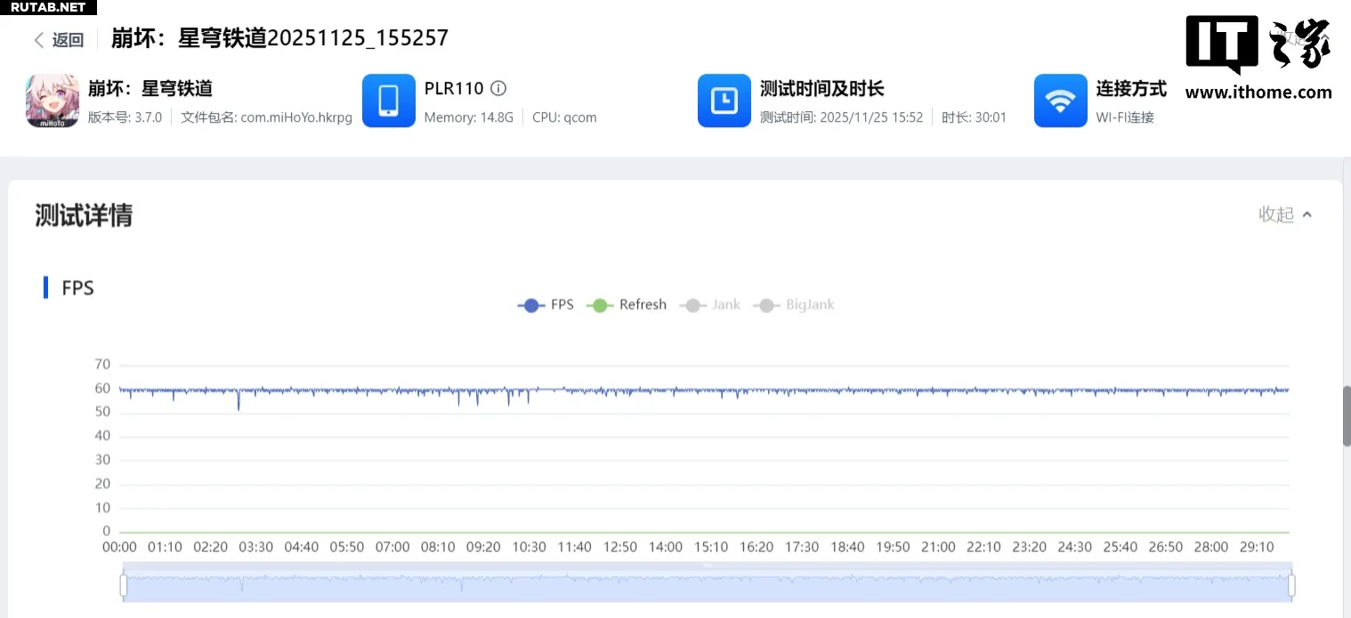 В «Honkai: Star Rail» с разрешением 972p и максимальными настройками средний FPS составил 59,6. График частоты кадров практически идеален.