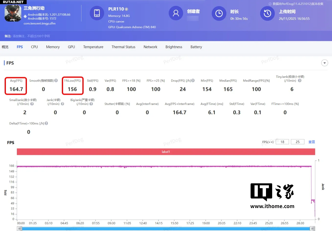 В шутере «Дельта-операция» с поддержкой 165 Гц смартфон показал средний показатель 164,7 кадра/с. Просадки минимальны — 1% Low составил 156 кадров. Геймплей плавный как при исследовании локаций, так и в перестрелках.