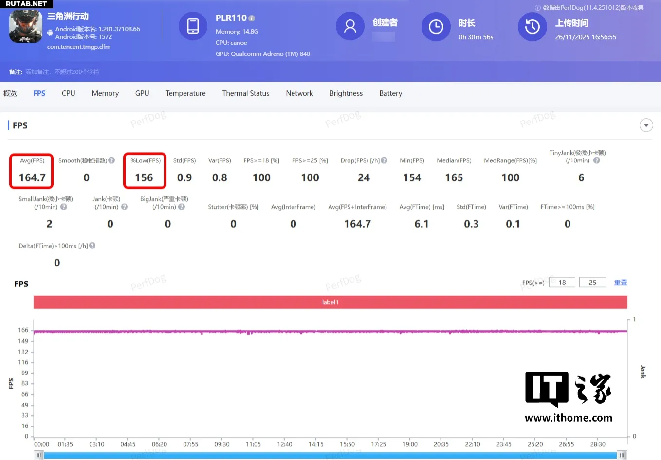 Запускаем один матч, и через 28 минут, когда игра закончилась, средний FPS достиг 164. Кривая частоты кадров в PerfDog по-прежнему представляет собой очень стабильную прямую линию. По сравнению с 120 кадрами, это явно более плавно, даже точность стрельбы повышается.