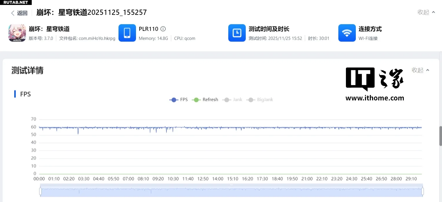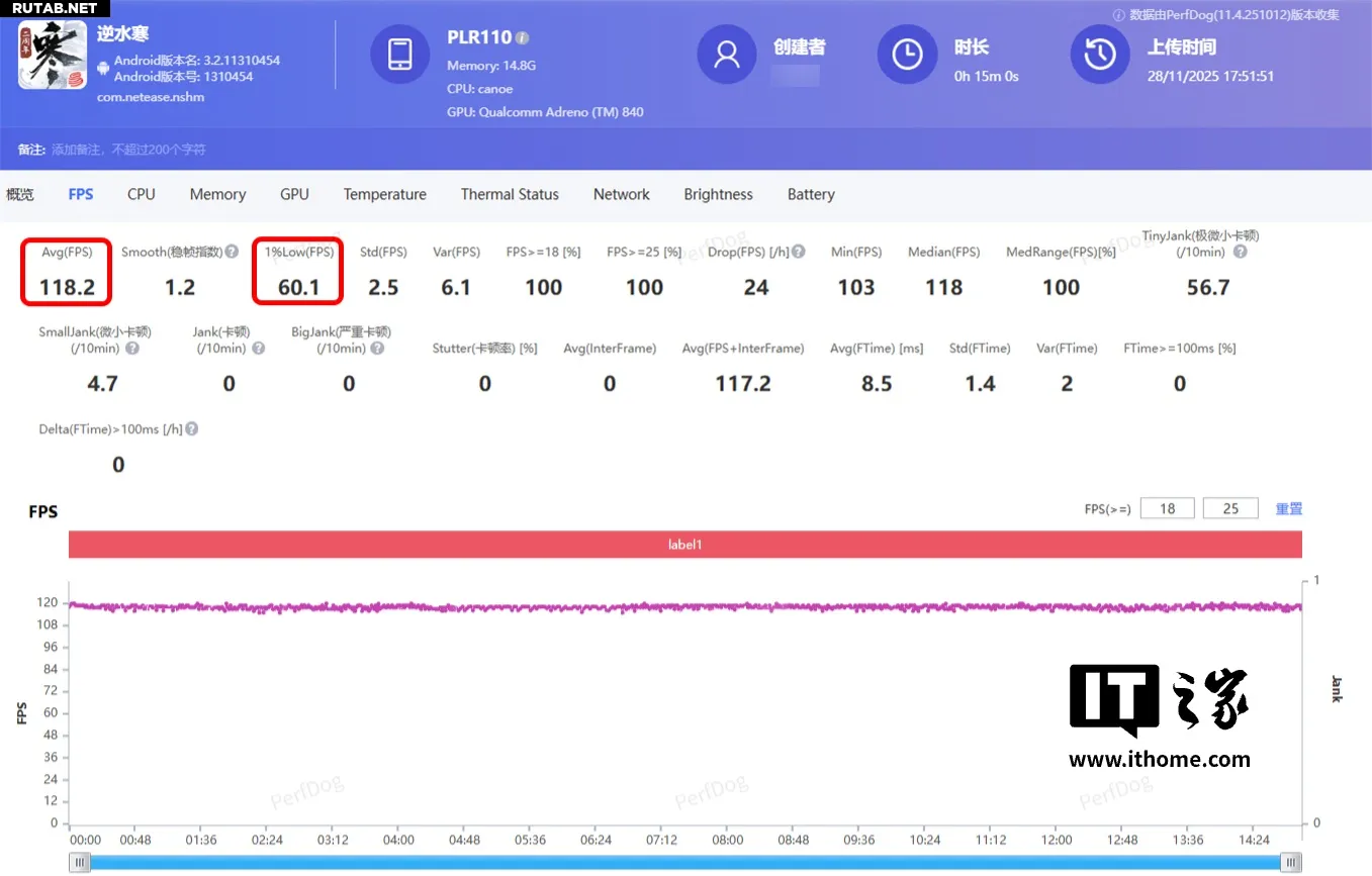 Сейчас мы говорим об этой функции, потому что ее оптимизация и опыт использования уже достаточно зрелые. В последней версии 3.2.1 игры «Justice Mobile» на карте «Guanshan» мы выставили всю графику на максимум, включили трассировку лучей в реальном времени и интерполяцию кадров, провели 15-минутный тест бега по карте. Средний FPS в игре достиг 118, кривая частоты кадров в PerfDog в целом по-прежнему представляла собой прямую линию. Опыт игры в «Justice Mobile» с высокой частотой 120 кадров также уникален для мобильных устройств.