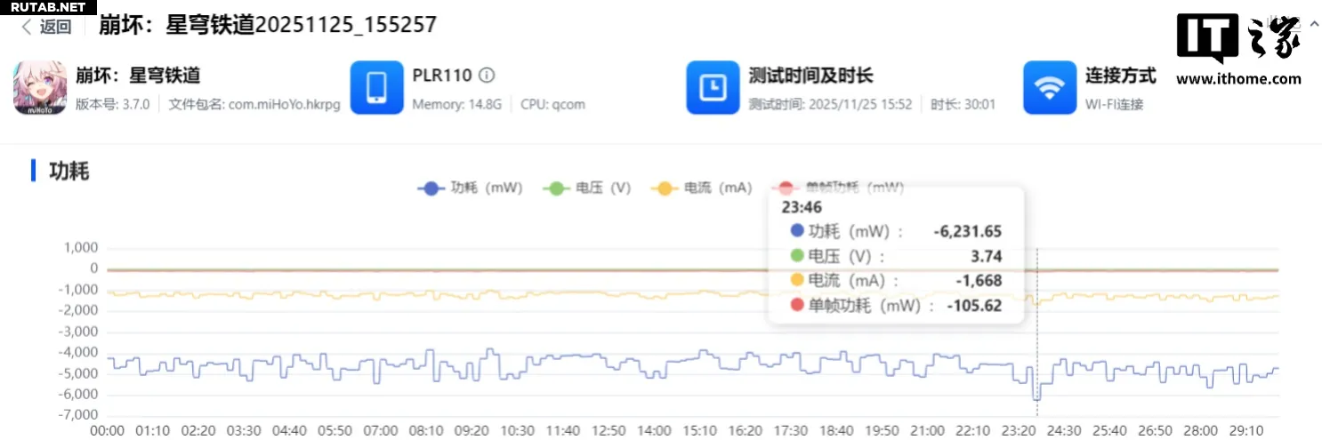 Затем в течение 60 минут в сети 5G мы проводили тест «Симуляция вселенной» в игре «Honkai: Star Rail», в итоге заряд сократился на 12%. Если экстраполировать этот результат, то OnePlus Ace 6T в сети 5G при непрерывной игре в «Honkai: Star Rail» предположительно сможет продержаться около 8 часов. Действительно, большая емкость аккумулятора говорит сама за себя.