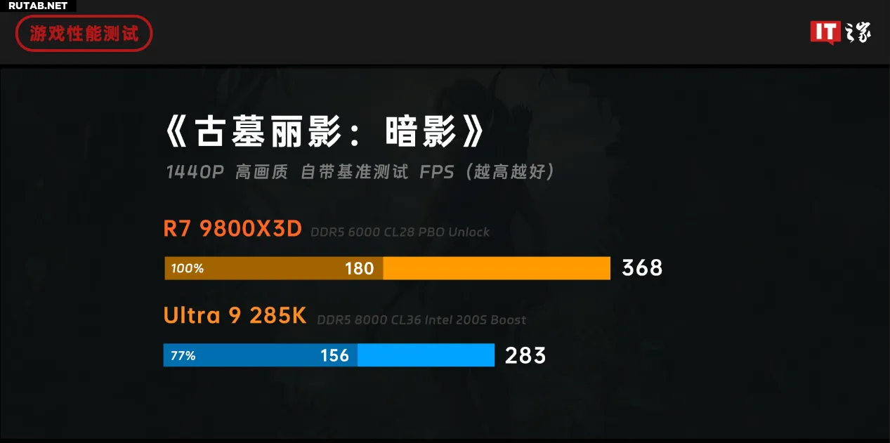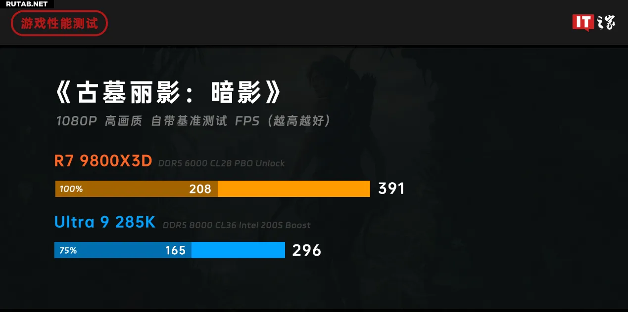 В классической RPG Shadow of the Tomb Raider по-прежнему доминирует AMD. В разрешении 1080p Ryzen 7 9800X3D опережает Core Ultra 9 285K на 32% по среднему FPS и на 26% по 1% Low FPS.