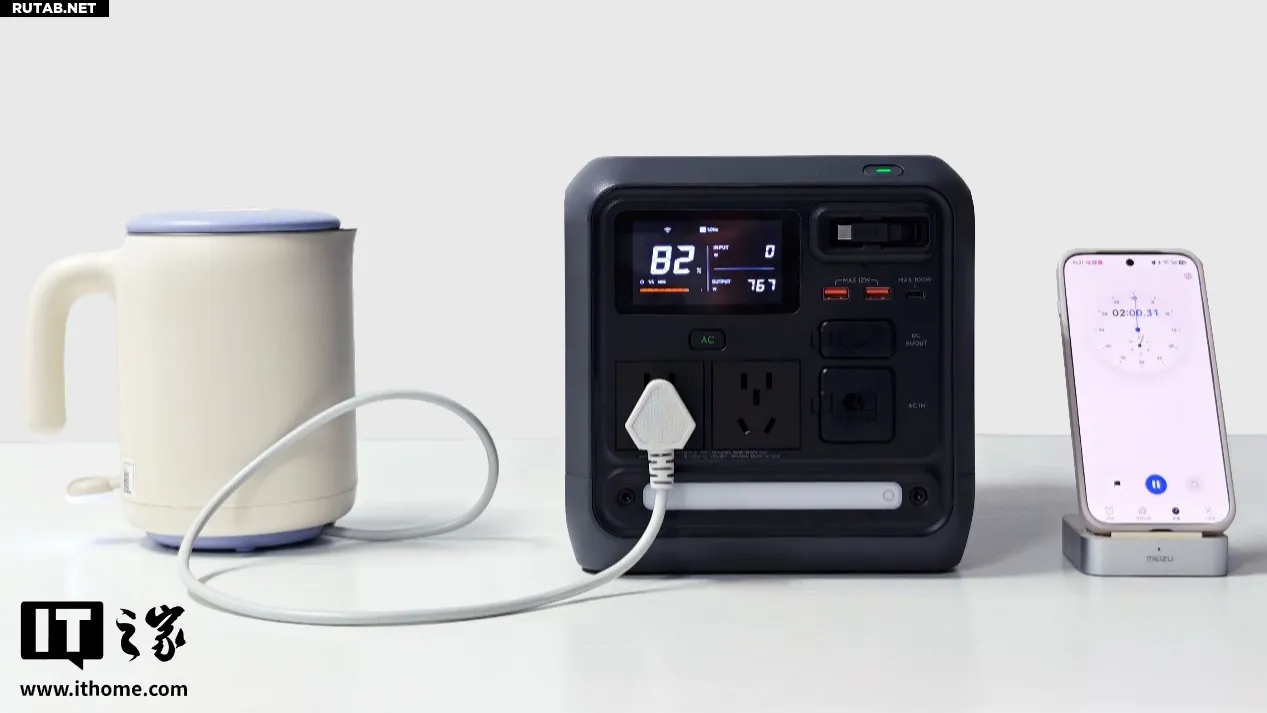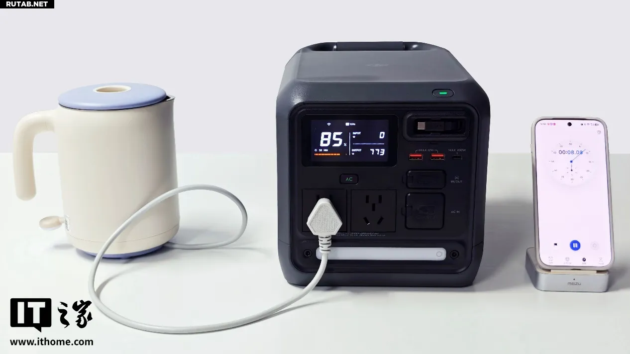 В сценарии кемпинга электрический чайник — незаменимый инструмент. Для теста мы использовали чайник мощностью 800 Вт, подключив его к разъёму AC на DJI Power 1000 Mini, и наблюдали за выходной мощностью на дисплее.
