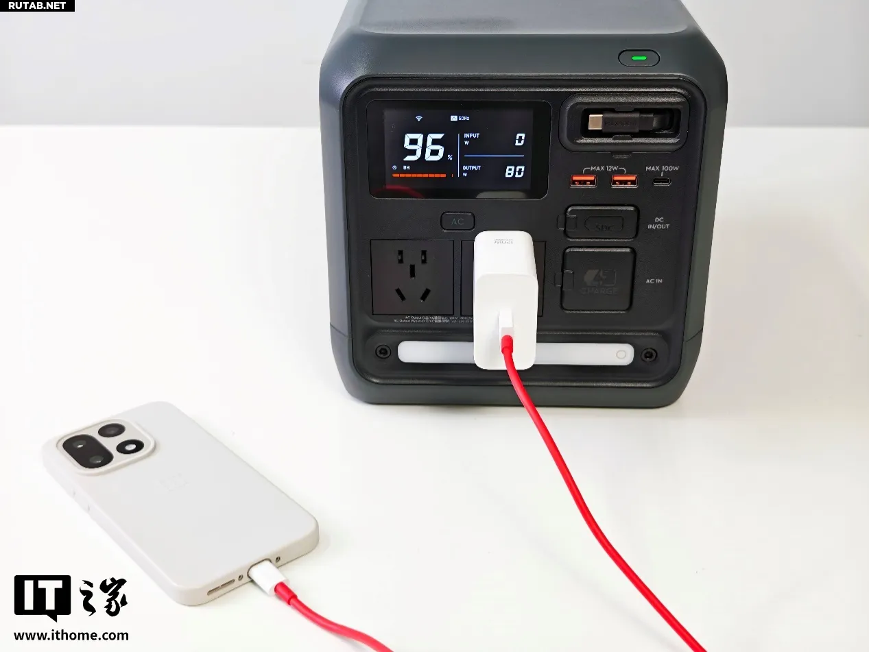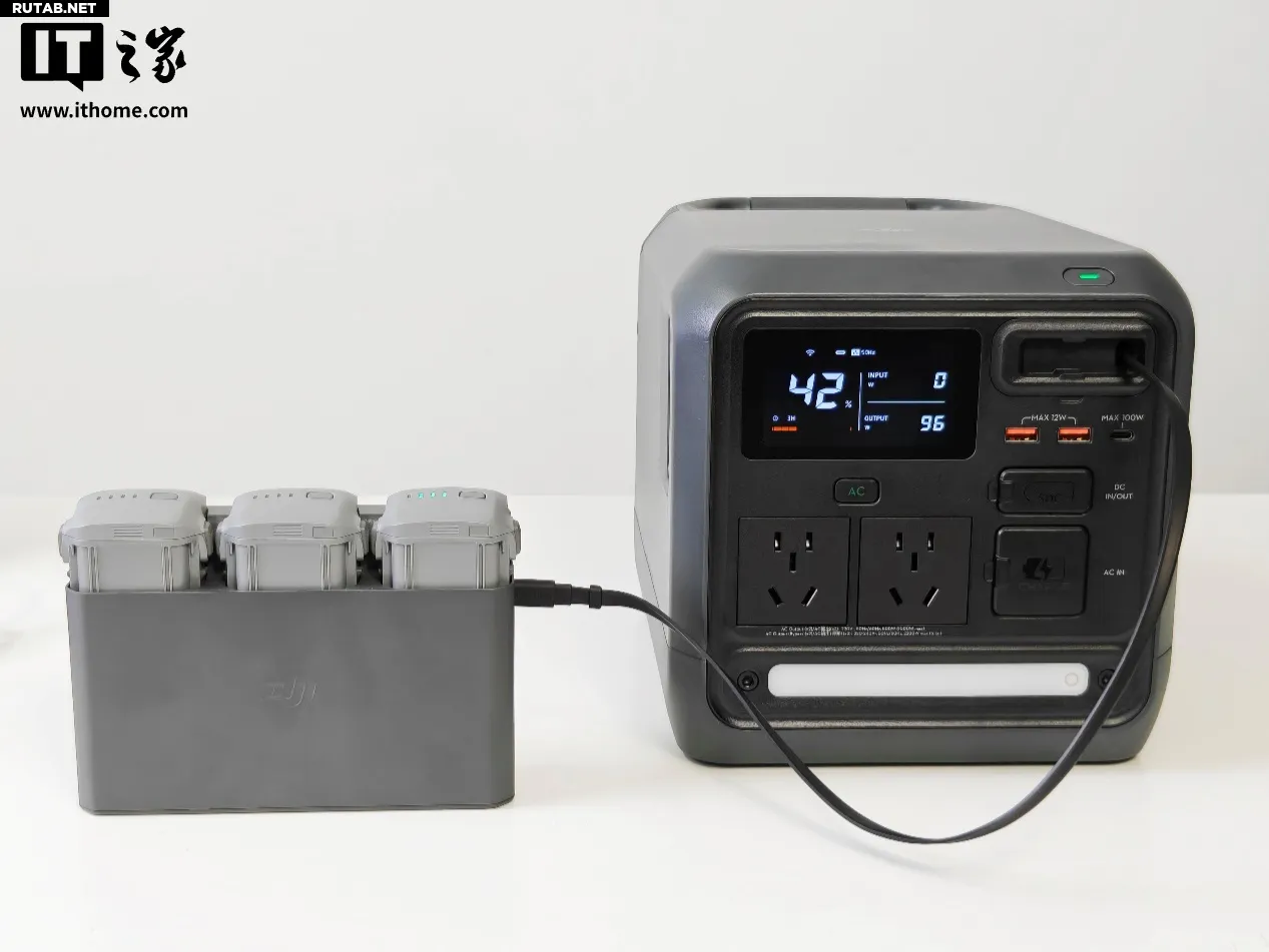 При использовании встроенного 100-ваттного выдвижного кабеля USB-C для питания зарядного хаба аккумуляторов дрона DJI Air 3S (остаток заряда батарей — 2 деления) мощность зарядки достигла 96 Вт. Стоит отметить деталь: при подключении устройства для зарядки под индикатором оставшегося заряда появляется красная прогресс-линия, отображающая текущий ход процесса. Это позволяет, даже отойдя от станции, одним взглядом оценить, как идёт зарядка.