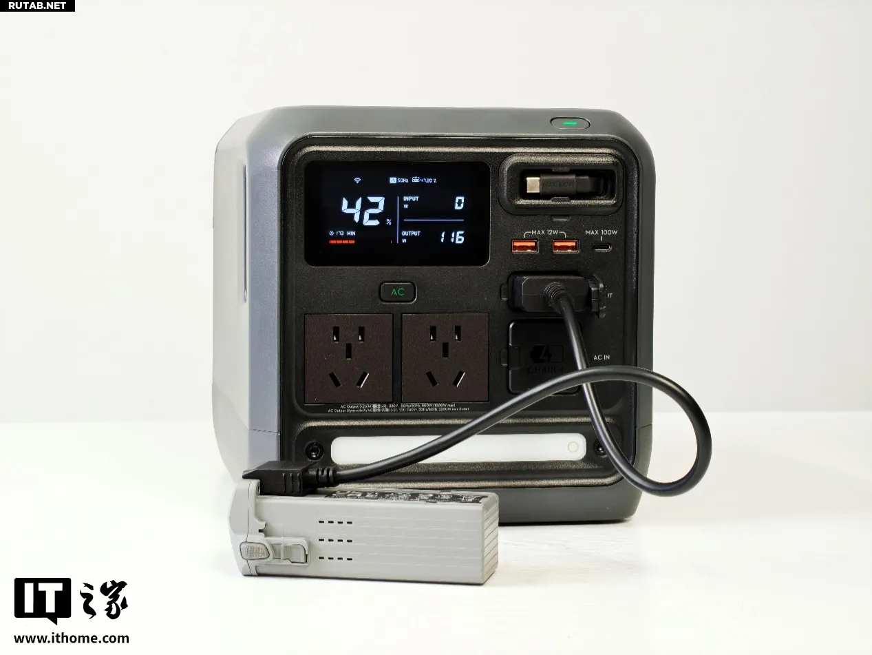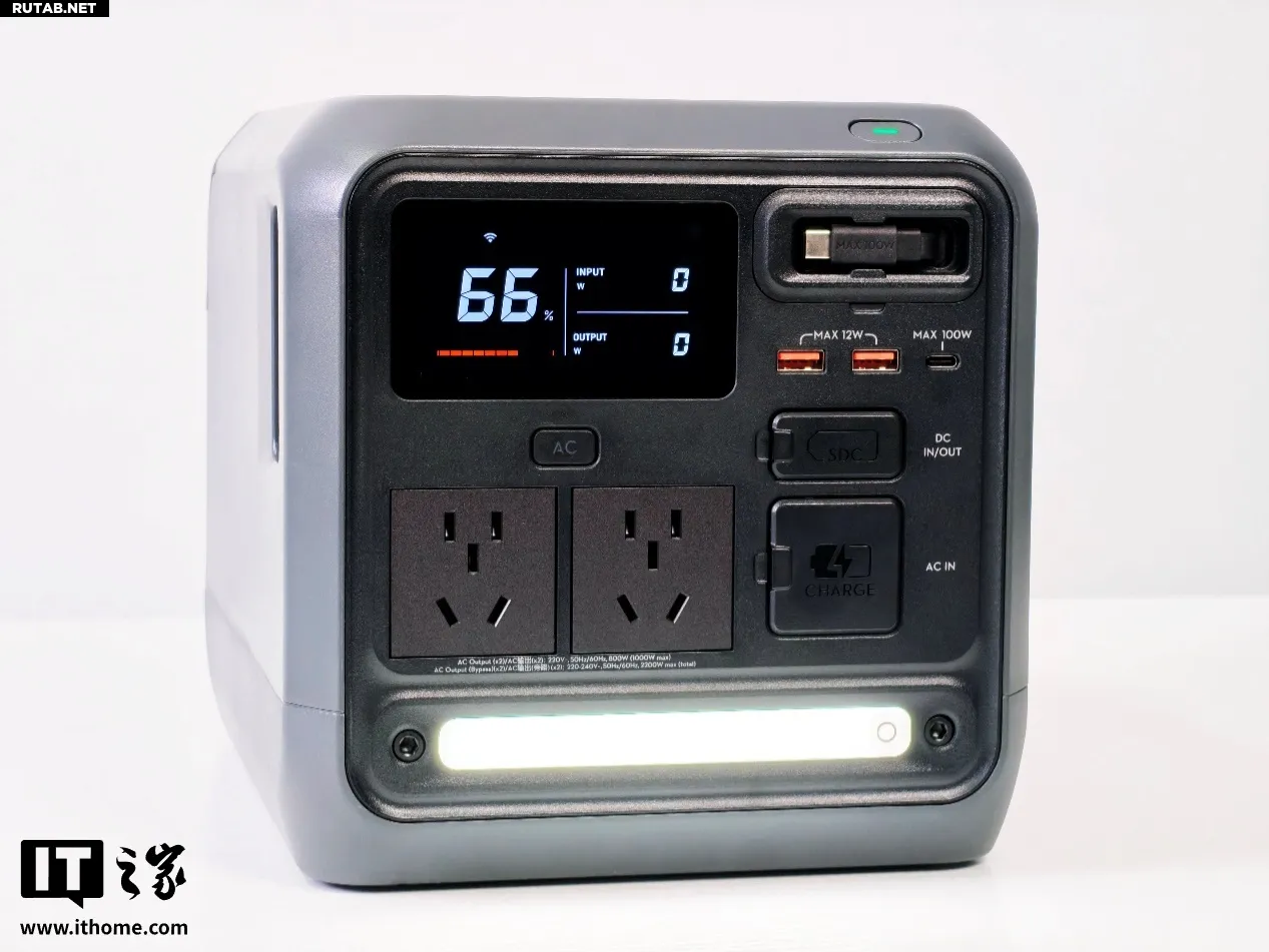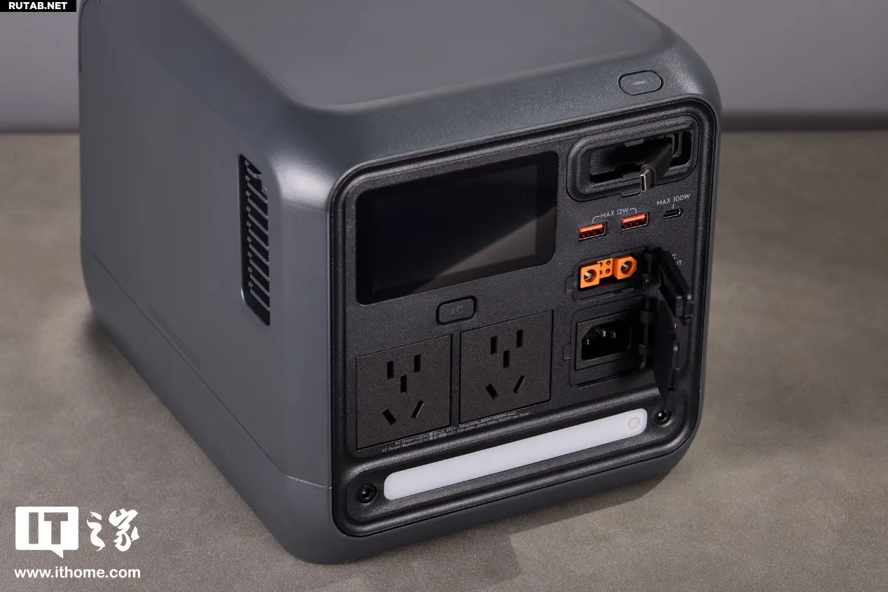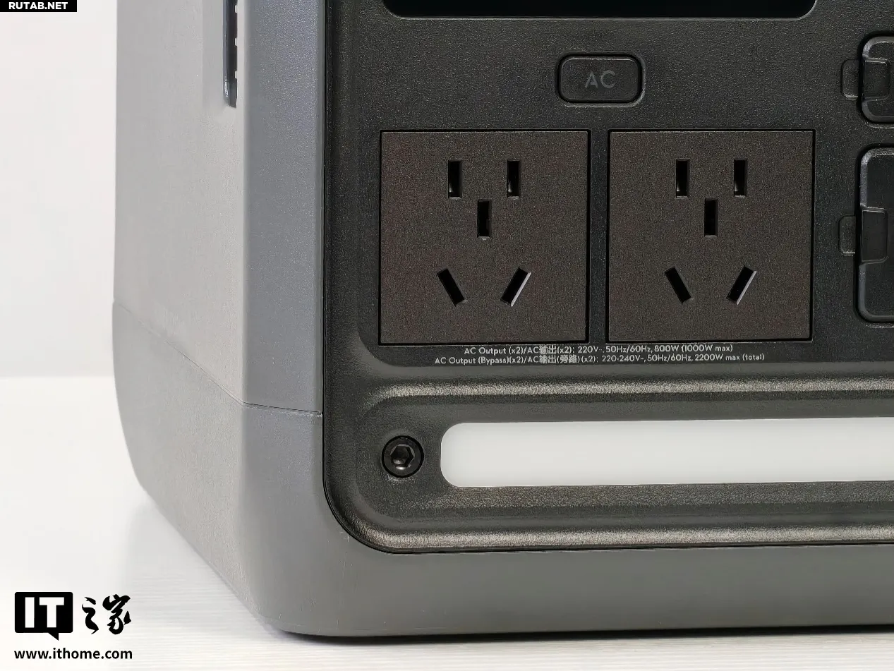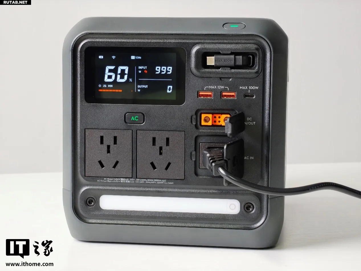 Расположенный на левой стороне корпуса разъём переменного тока (AC) поддерживает выходное напряжение 220–240 В с максимальной продолжительной мощностью до 1200 Вт (в режиме разгона). Также имеется встроенная функция быстрой зарядки от автомобиля мощностью 400 Вт. Несмотря на компактные размеры, станция способна удовлетворить потребности многих мощных электроприборов и практически всех популярных гаджетов, идеально подходя для работы на открытом воздухе, туристической съёмки и интенсивной зарядки в автомобиле.