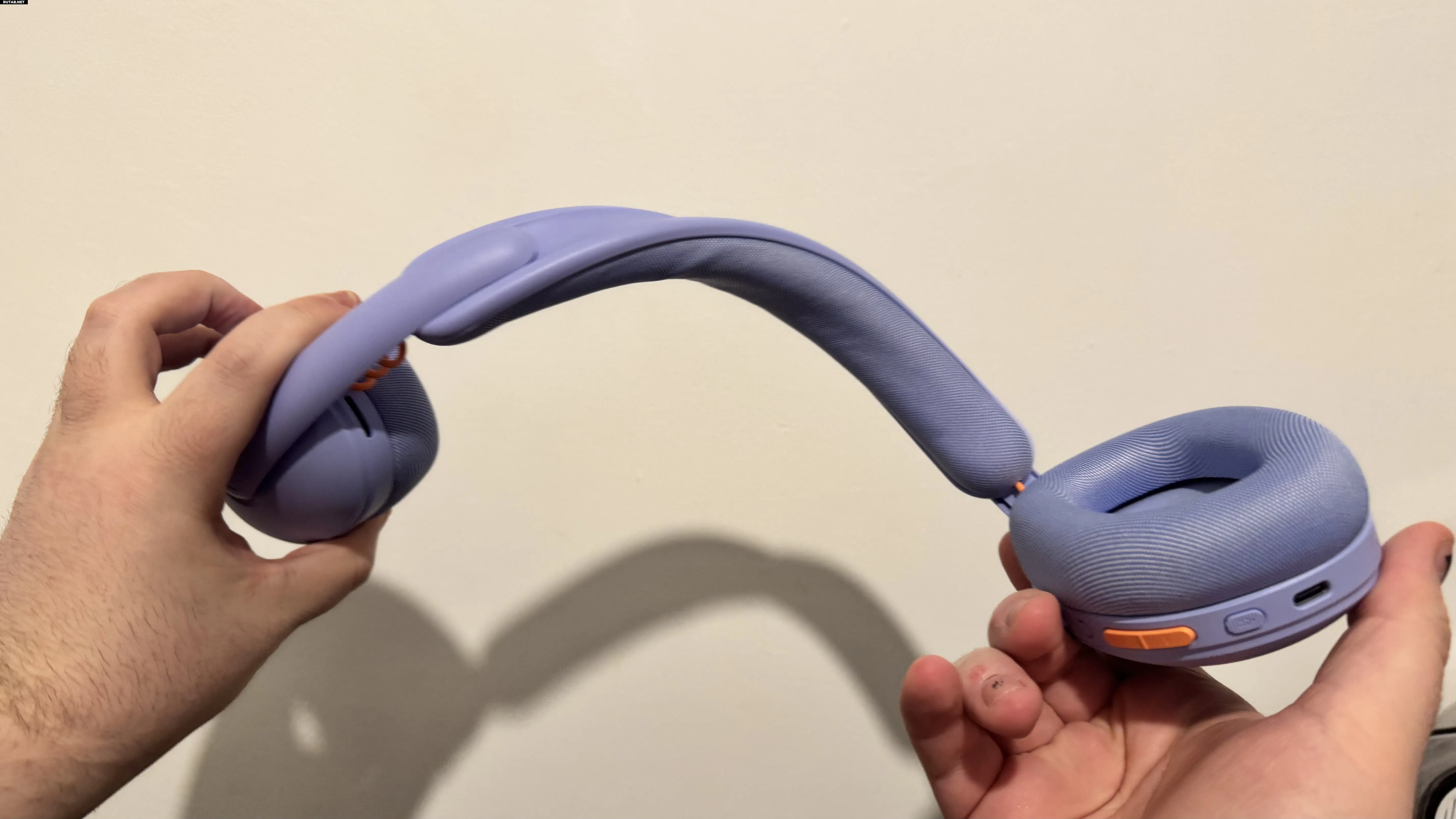 Кстати, эта гибкая гарнитура в сложенном виде напоминает конфету. Большую фиолетово-оранжевую конфету с кнопками сбоку. Она заметно не похожа на типичный «1337»-гаджет и скорее напоминает повседневную гарнитуру вроде AirPods Max. Мне кажется, этот дизайн хорошо отражает моё общее впечатление: надеть её и выйти из дома так же просто, как и подключить к ПК.