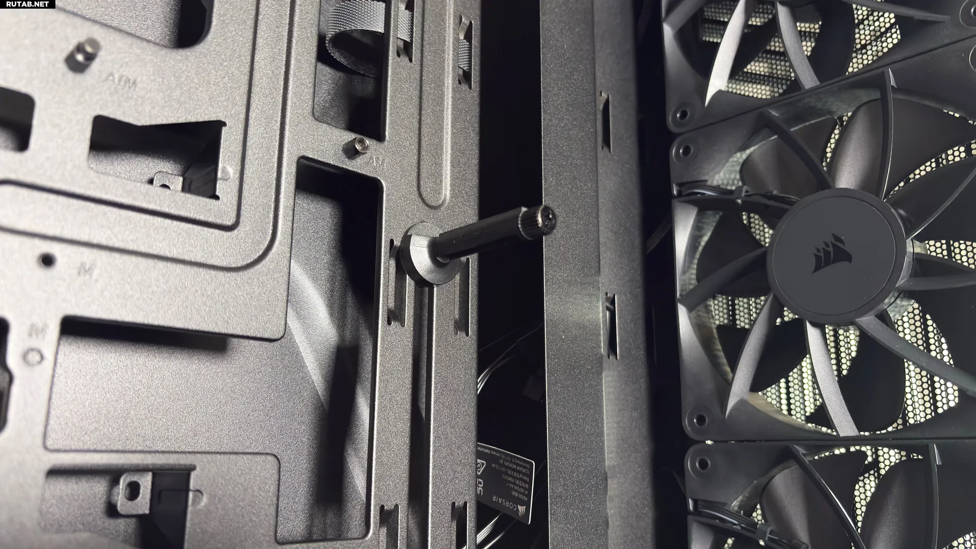 В отличие от некоторых корпусов в этой ценовой категории, заглушки слотов расширения в 3200D съёмные и заменяемые. Также здесь есть кабельная шторка, скрывающая провода за лотком материнской платы, что поддерживает концепцию Back-connect. Предусмотрена и подпорка для видеокарты, хотя, на мой взгляд, дизайн Corsair здесь немного слабее, чем у других, из-за недостаточной гибкости (она часто упирается прямо в центр кулеров карты). В целом, это те детали, которые я привык видеть в качественных корпусах, но которые часто (хотя и не всегда) урезают в более бюджетных моделях.