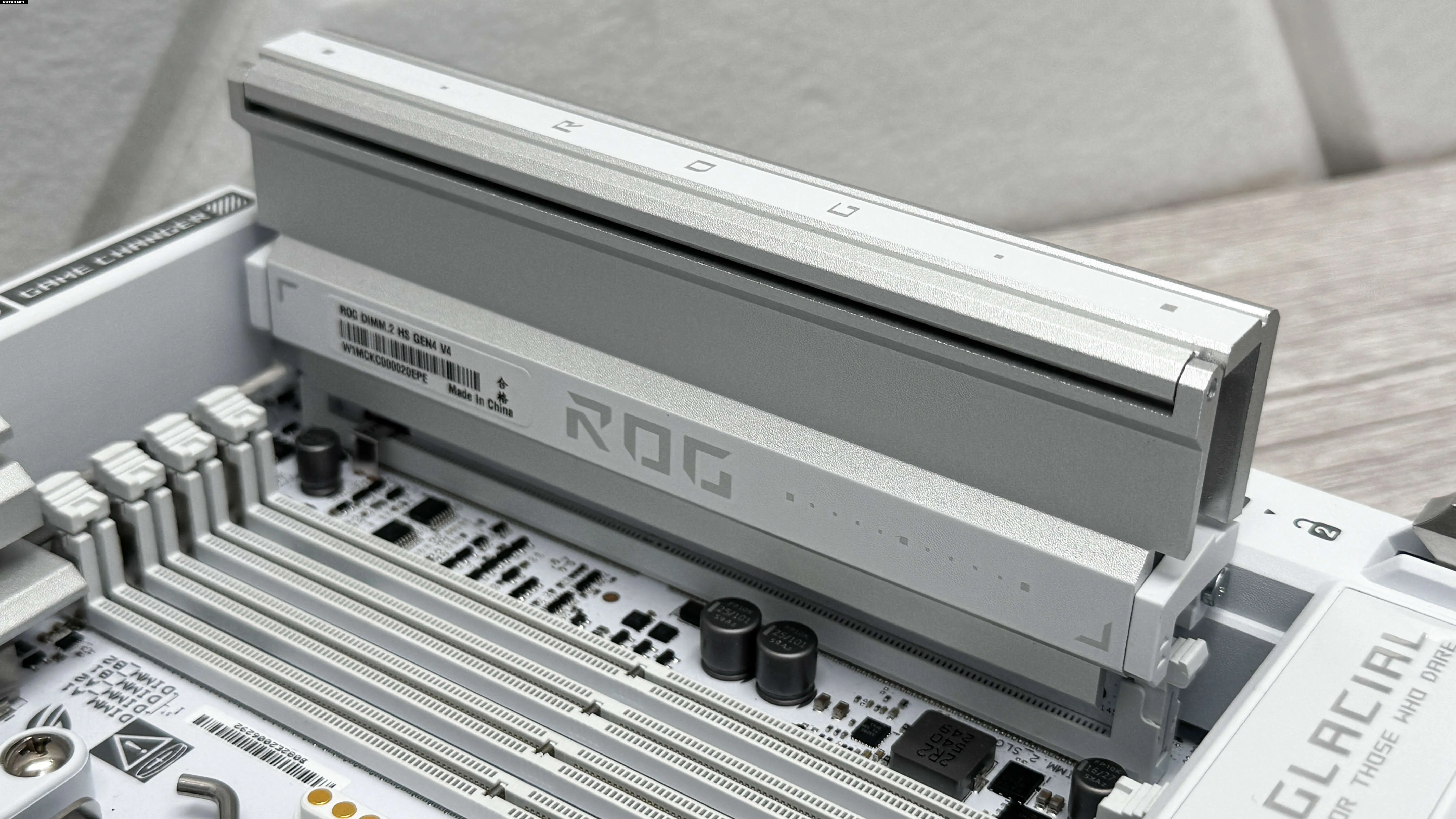 Однако её не обязательно убирать в коробку — с помощью магнитов её можно прикрепить к корпусу вашего ПК. Огромный радиатор M.2 над слотом оснащён тепловой трубкой для улучшения охлаждения, а ещё более массивный расположен под тематическим кожухом ROG ниже и охлаждает два дополнительных порта M.2. Внимательный глаз мог заметить, что в спецификациях указано наличие семи портов M.2, при этом на самой плате их всего три (включая два с поддержкой PCIe 5.0).