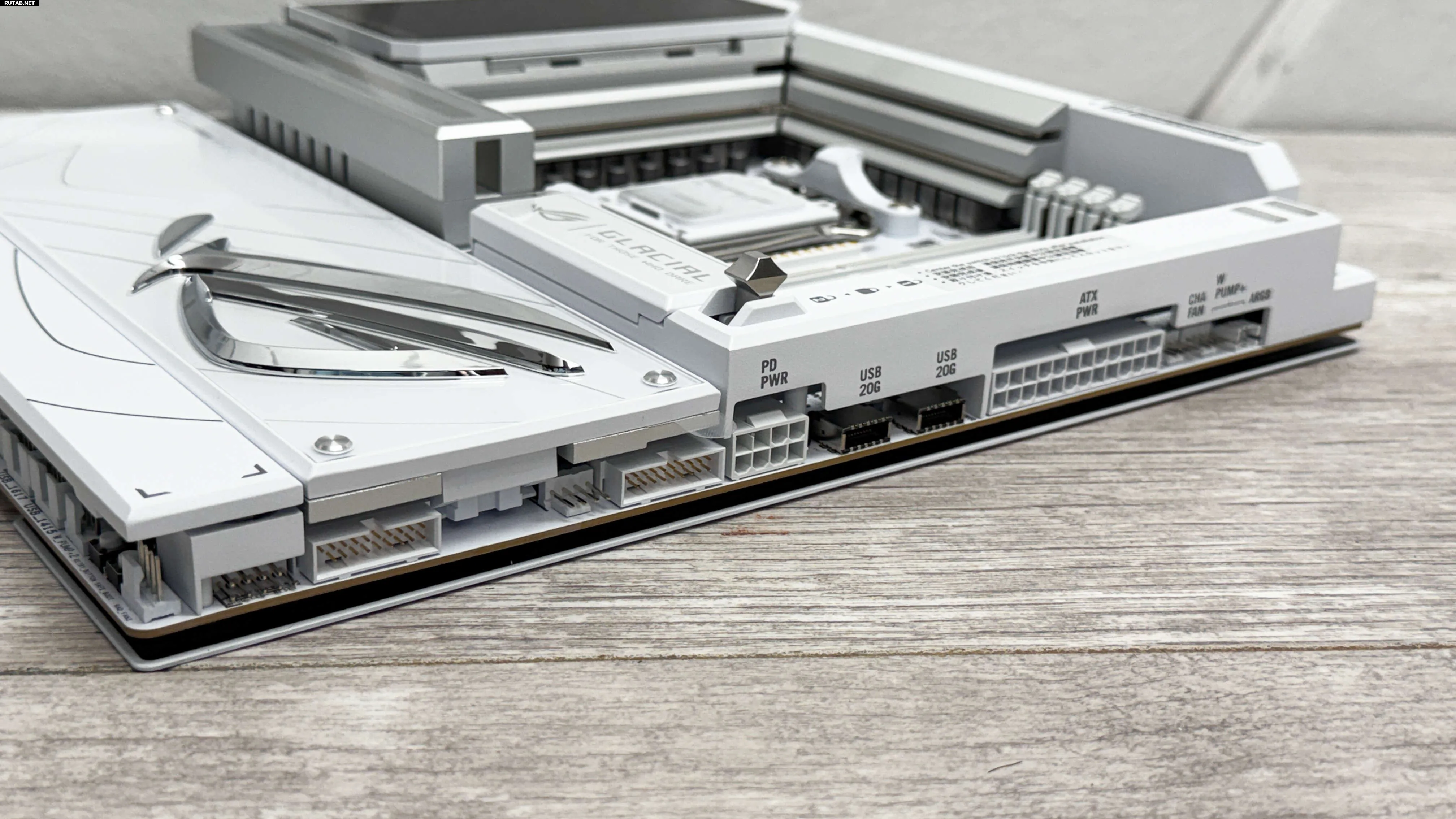 Как следует из названия, ROG Crosshair X870E Glacial существует только в белом исполнении, и любой поклонник белого «железа» будет от неё в восторге. Большая часть текстолита платы скрыта под съёмными радиаторами или кожухами, маскирующими не самые эстетичные порты. Их можно снять для удобства прокладки кабелей, так как большинство крепятся на магнитах. Это касается и большой крышки с логотипом ROG, которую, скорее всего, придётся убрать, так как она закрывает основной слот PCIe.