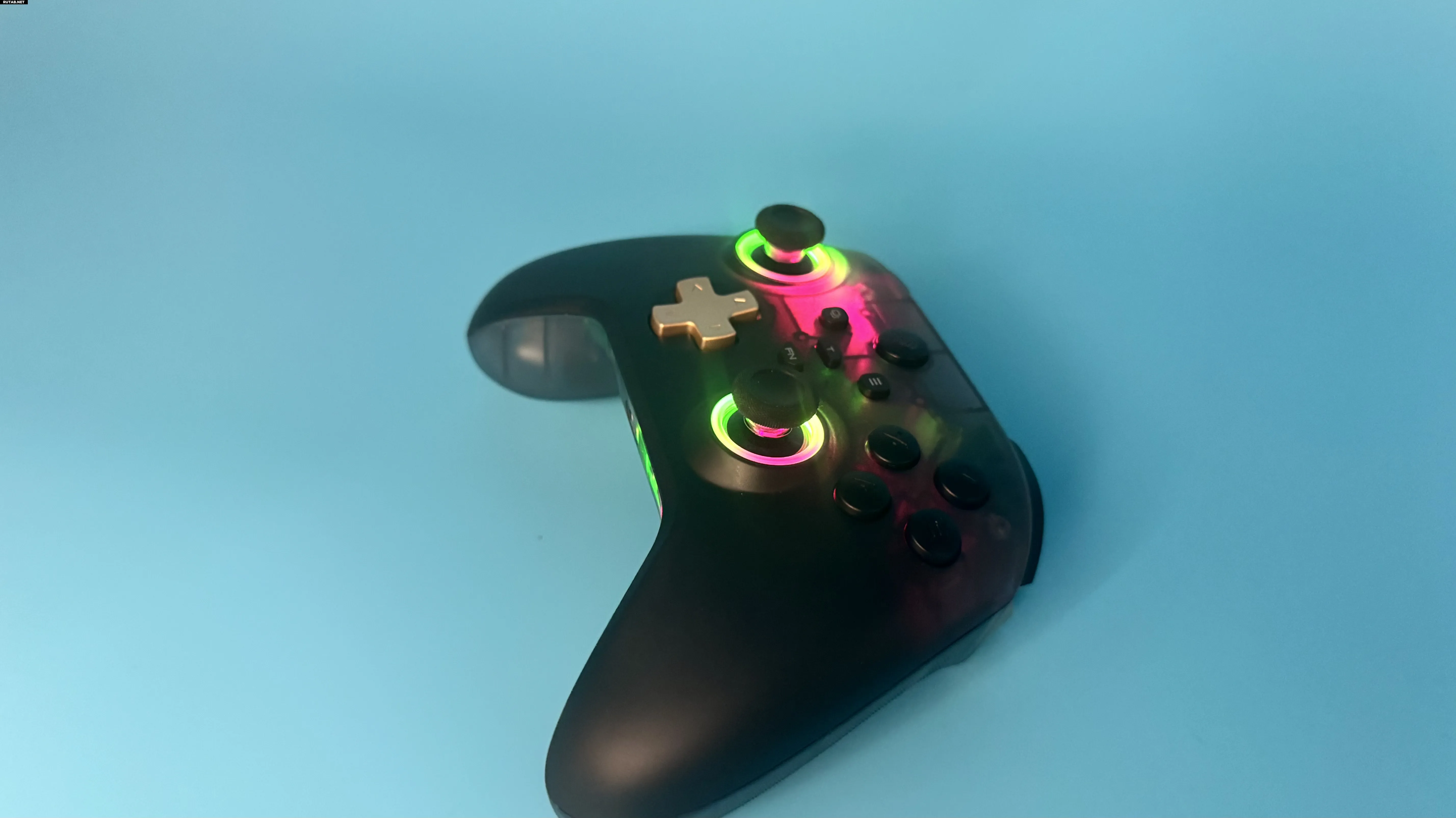 Однако, после подключения и включения, контроллер оживает и становится ещё эффектнее. Под каждым мини-джойстиком расположена подсветка RGB. Чёрный пластик пропускает довольно много света, что по эстетике находится где-то между обычным геймпадом и старым прозрачным контроллером для Xbox. Подсветка, просвечивающая сквозь пластик, иногда может выглядеть немного дешёво, но в случае с D05 это в целом удачное решение.