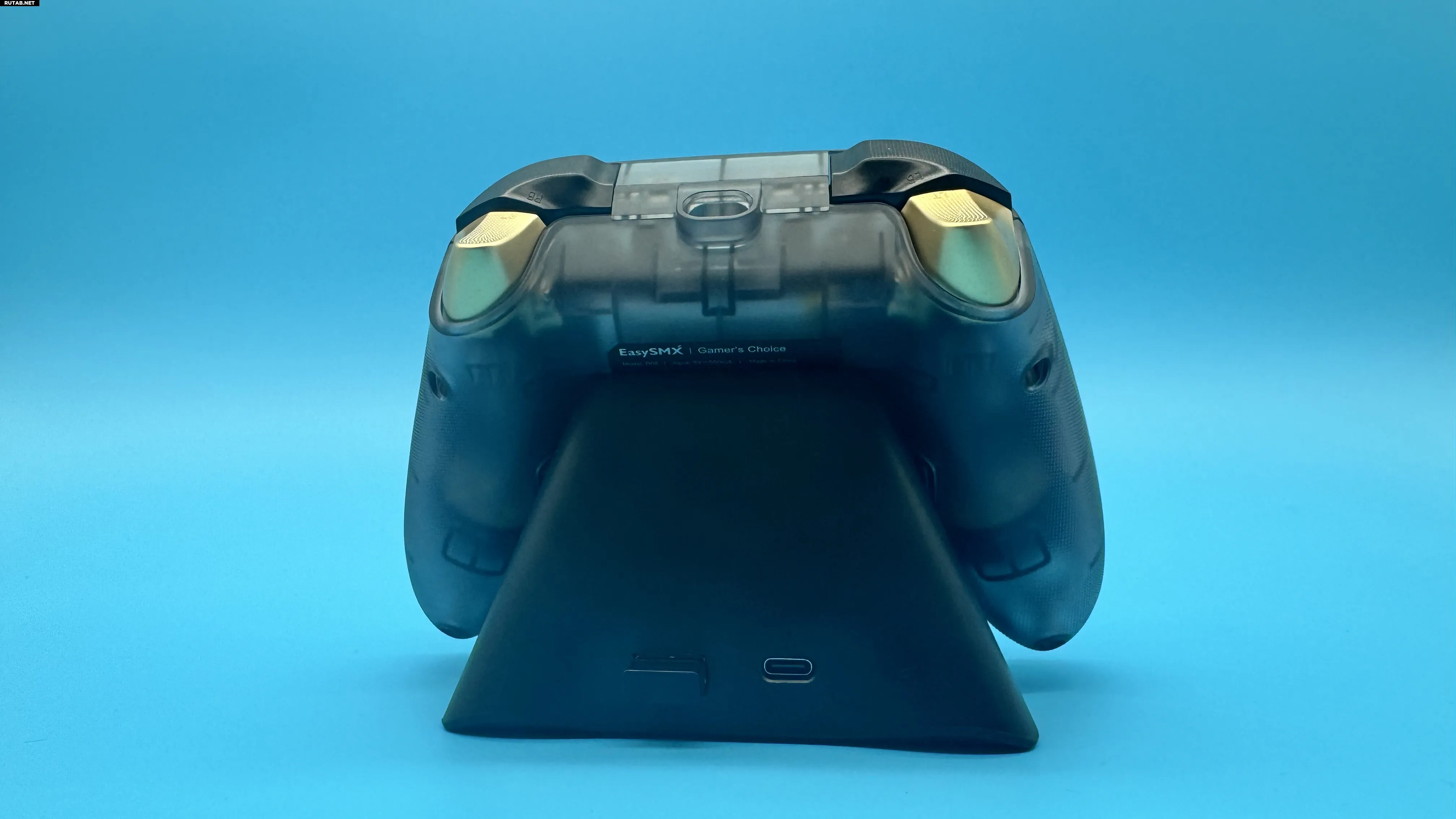 D05 доступен только в одном цветовом варианте, но, к счастью, он мне нравится. Корпус полностью чёрный, за исключением золотистого крестовины и триггеров. Кнопки-бамперы, что примечательно, такого же чёрного цвета, как и основные кнопки, и джойстики. В целом, контроллер выглядит одновременно довольно ярко и аккуратно. Входящая в комплект док-станция для зарядки, напротив, довольно проста — полностью чёрная, с логотипом «EasySMX» на передней панели.